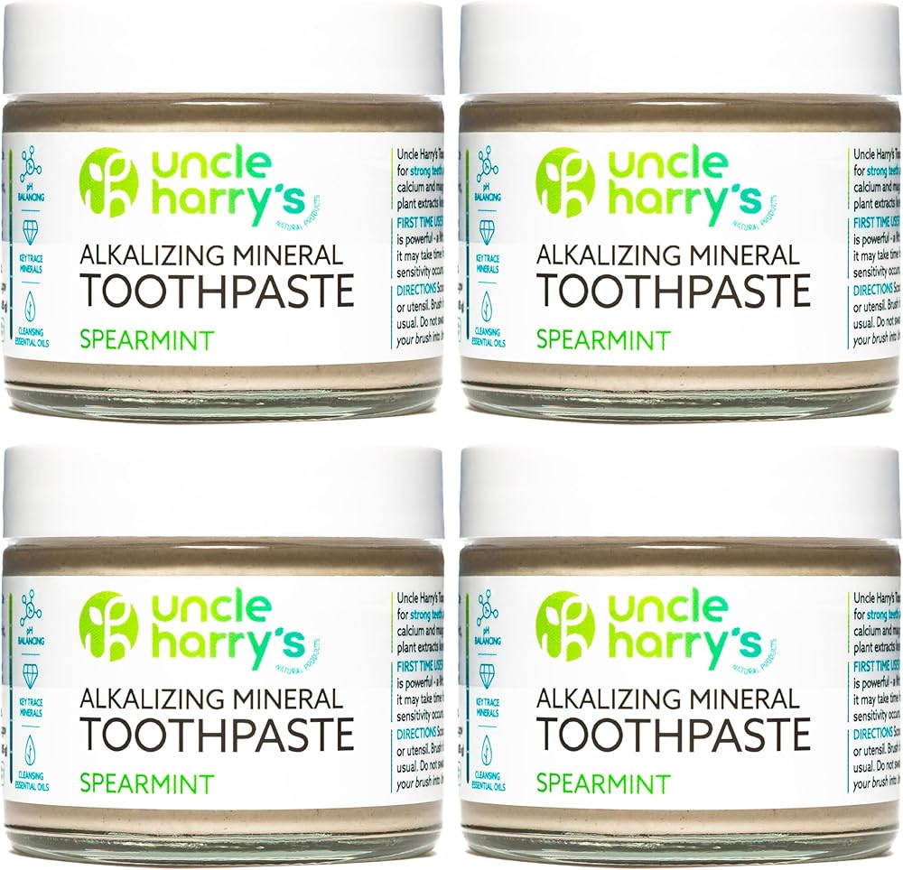 معجون أسنان Uncle Harry's Natural Products خالٍ من الفلورايد، نعناع - مصنوع من طين البنتونيت والفضة الغروية وخلاصة النباتات النقية ومطهر، عبوة من 4 قطع