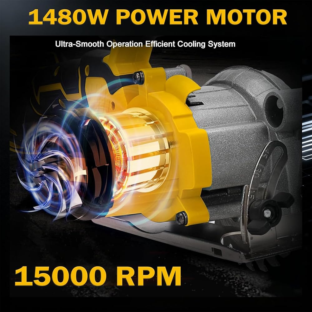Powerful motor:Corded Circular saw equipped with Powerful 1480W motor delivering a no load speed up to 15000 RPM. Skill saw slicing through wood, PVC pipes, laminate flooring, plastics, plasterboard, and MDF with ease