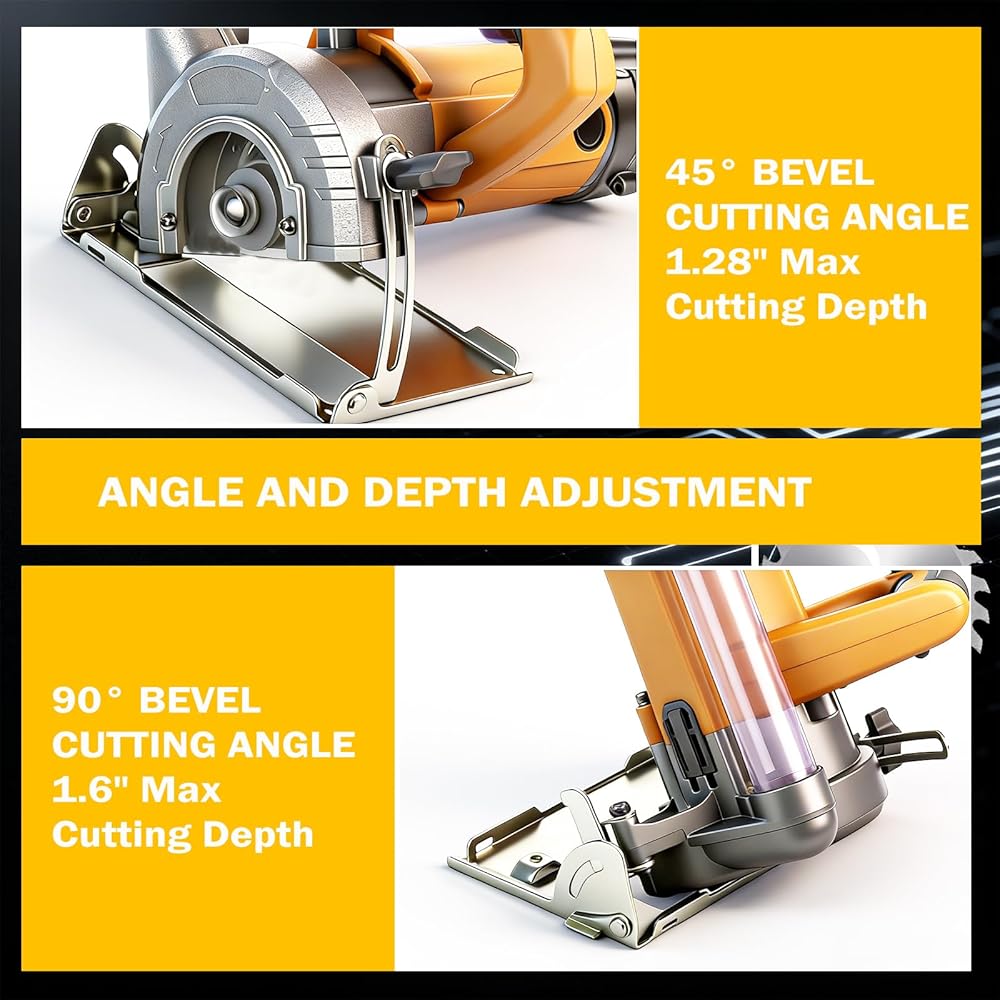 Adjustable depth and bevel:Compact circular saw Adjustable depth (1-11/16" at 90°) and 0-45° bevel capacity for angled cuts, you can freely adjust the cutting according to your needs. The maximum cutting depth at 90 degrees is 1-11/16", and the bevel cutting capacity at 45 degrees is 1-1/8"