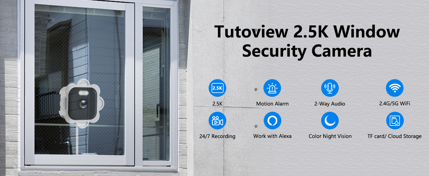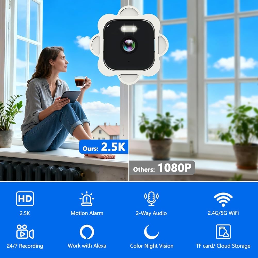 كاميرا نافذة 2.5K، كاميرات أمان للنافذة 5 جيجا هرتز و2.4 جيجا هرتز مع رؤية ليلية ملونة، كاميرا WiFi مع كشف الحركة، تسجيل مستمر، صفارة إنذار، تنبيهات في الوقت الحقيقي، صوت ثنائي الاتجاه (أبيض)