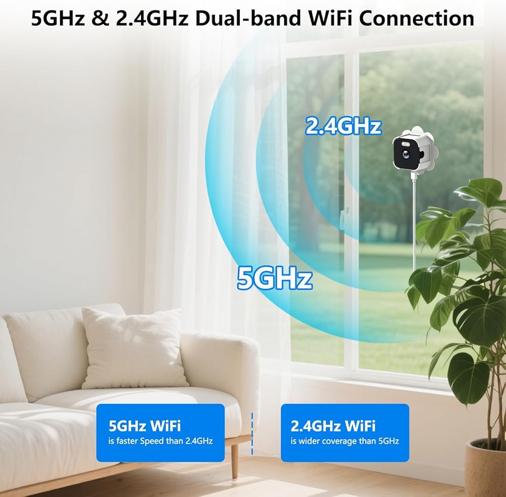 【واي فاي ثابت ثنائي النطاق للأمان الداخلي】: تدعم كاميرا الأمان الداخلية هذه شبكات WiFi 2.4 جيجا هرتز و5 جيجا هرتز للاتصال المرن والمستقر. يوفر النطاق 2.4 جيجا هرتز تغطية أوسع، بينما يوفر النطاق 5 جيجا هرتز سرعات أعلى مع تداخل أقل، وهو مثالي للكاميرا الداخلية التي تنظر إلى الخارج من خلال النافذة دون تأخير أو انقطاع في الإشارة.