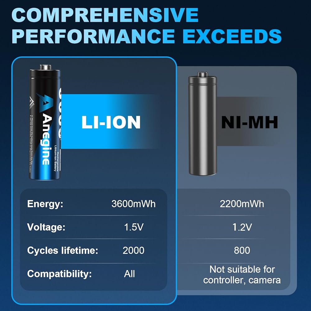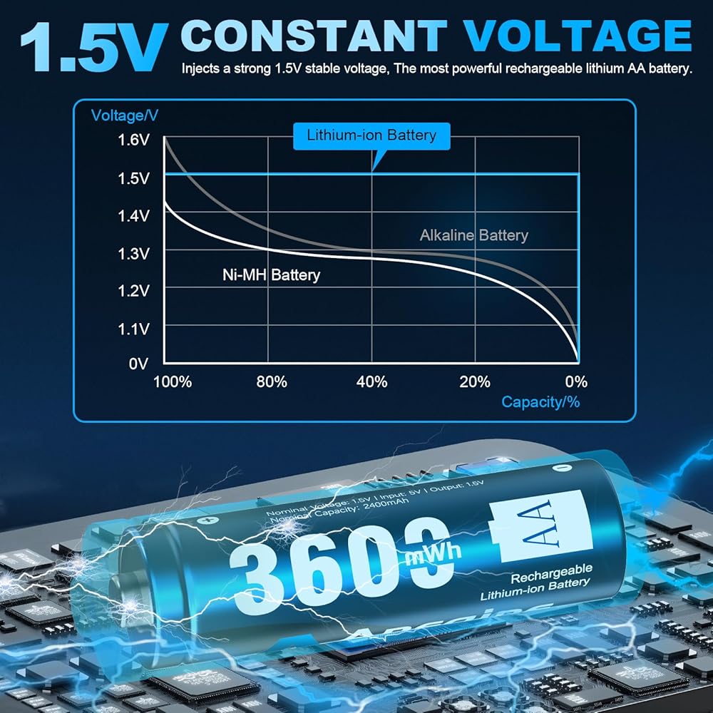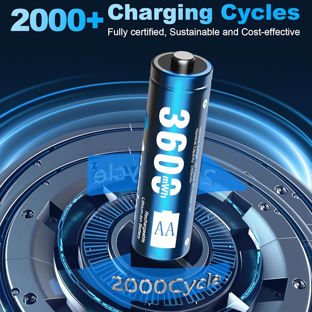 【طاقة عالية السعة 3600 مللي واط في الساعة】توفر بطاريات الليثيوم AA القابلة لإعادة الشحن سعة عالية تبلغ 3600 مللي واط في الساعة، مما يجعلها بديل الليثيوم المثالي لبطاريات الوميض للأجهزة المتعطشة للطاقة مثل أجهزة التحكم في الألعاب، ومعدات الواقع الافتراضي، وخاصة احتياجات بطاريات الكاميرا الخارجية الوامضة. تتفوق بطاريات الليثيوم AA هذه على خلايا AA القياسية بكثافة طاقة أعلى، مما يضمن عدم نفاد بطاريات الكاميرا الوامضة الخاصة بك أبدًا في اللحظات الحرجة. سواء كنت بحاجة إلى بطاريات ليثيوم AA قابلة لإعادة الشحن لأقفال الأبواب الذكية، أو الأجهزة الطبية، أو بطاريات ليثيوم AA 1.5 فولت للكاميرا الوامضة، فإن بطاريات الليثيوم AA القابلة لإعادة الشحن توفر طاقة موثوقة وطويلة الأمد.