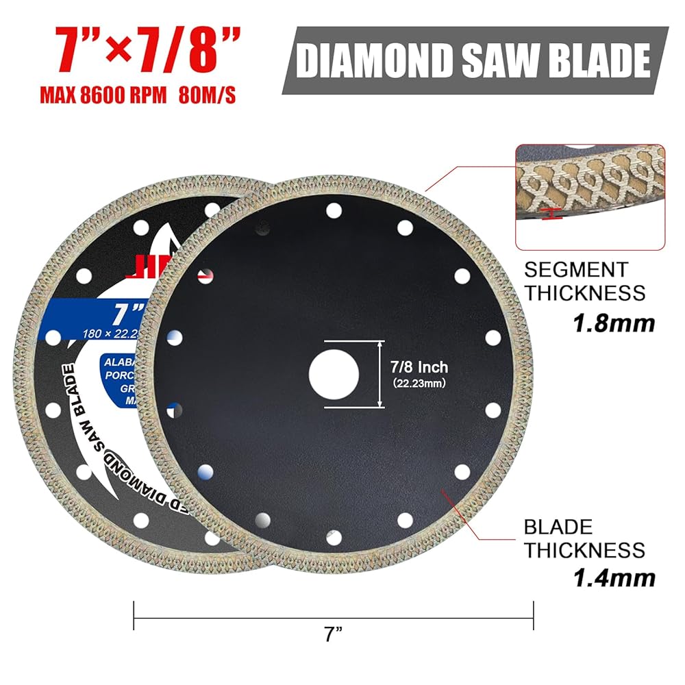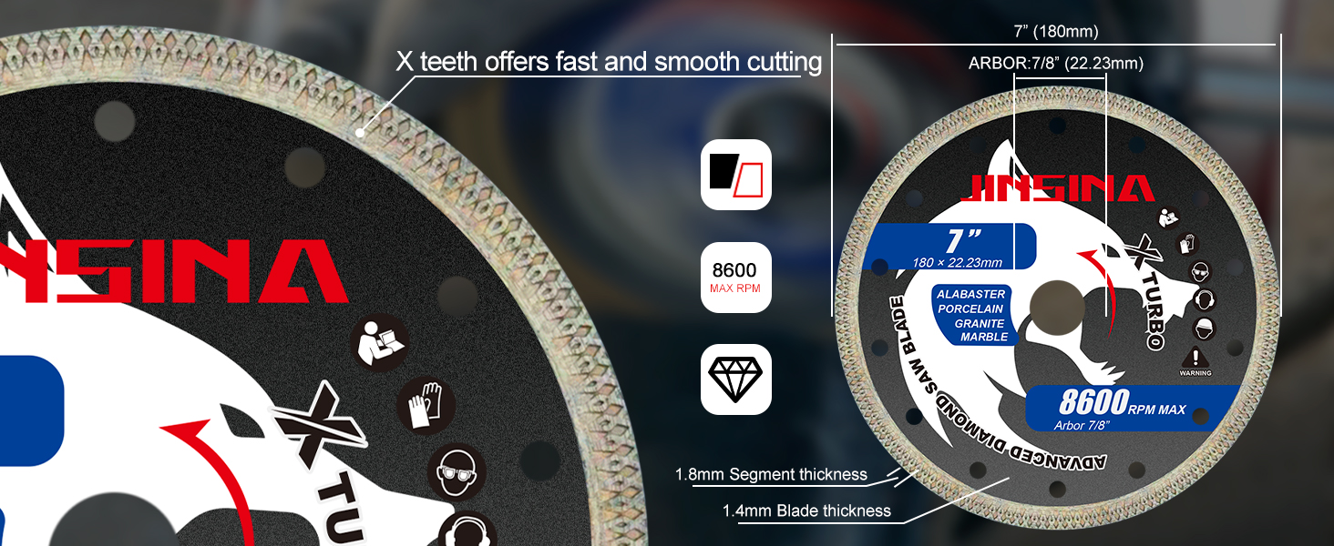 【الأبعاد العالمية】القطر الخارجي: 7 بوصات، القطر الداخلي: 7/8 بوصة، سمك الشفرة: 1.4 ملم، سمك القطعة: 1.8 ملم، تعمل حتى 8,600 دورة في الدقيقة. مناسبة لمعظم مناشير البلاط، والمطاحن الزاوية المحمولة باليد، والمناشير الرطبة مع أربور 7/8 بوصة.