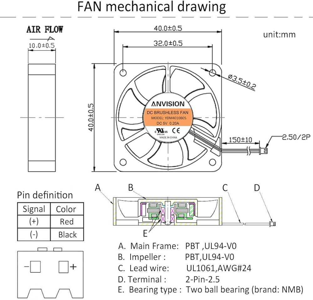 انفيجن مروحة تبريد 40 ملم × 10 ملم تيار مستمر 5 فولت بدون فرشاة، محمل كروي مزدوج، بدبوسين