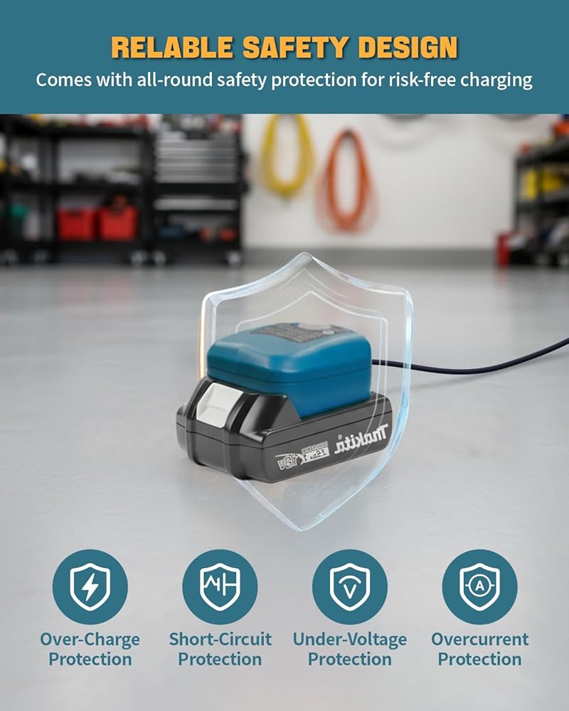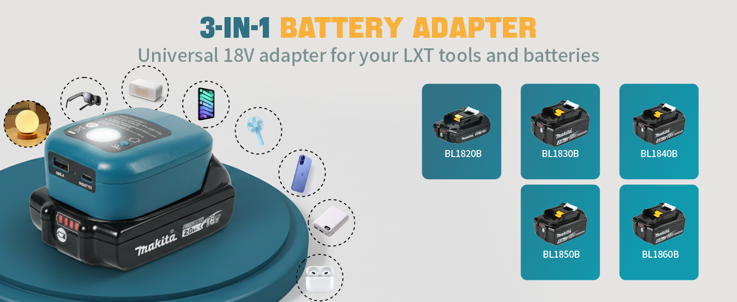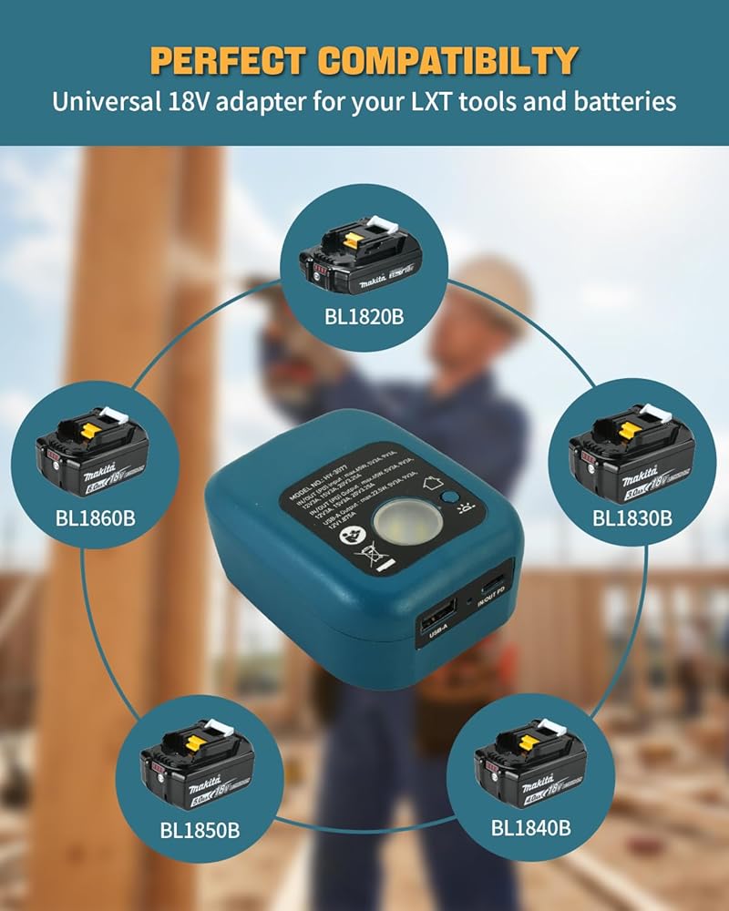 توافق واسع - يعمل محول بطارية USB هذا لماكيتا بسلاسة مع بطاريات ماكيتا 18 فولت (موديلات BL1830B، BL1850B، BL1860B، BL1840B، BL1820B). إنه المحول المثالي لبطارية ماكيتا لتحويل بطارية أداتك إلى محطة طاقة متعددة الاستخدامات للجراج أو ورشة العمل أو المشروعات التي تصنعها بنفسك.