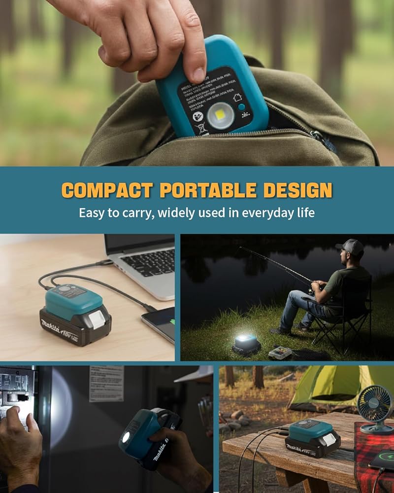 محول بطارية متوافق مع بطارية ماكيتا 14-18 فولت، محول مصدر طاقة البطارية مع منافذ USB-C وUSB-A لـ BL1830B BL1850B BL1850B BL1840B BL1820B، مصباح يدوي LED بقدرة 2 وات