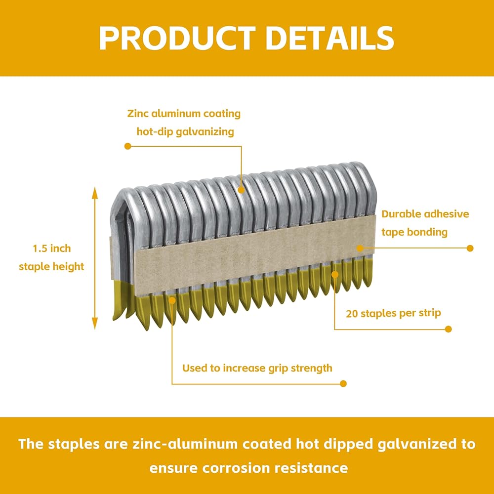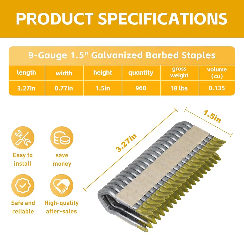 • DIMENSIONS: 1.5-inch length galvanized barbed staples made with heavy-duty 9-gauge wire for superior holding power