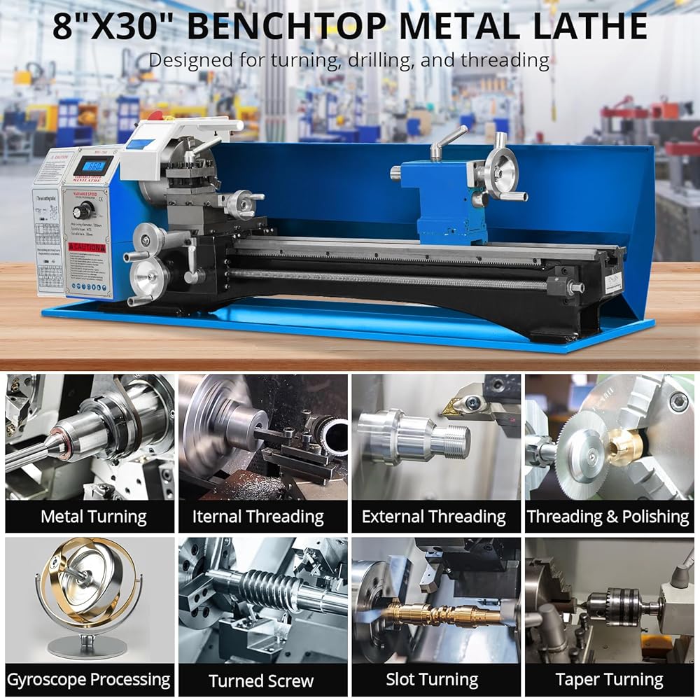 Compact Design: With a benchtop size of 8" x 30", this lathe is perfect for small workshops, allowing you to maximize your workspace without sacrificing functionality.