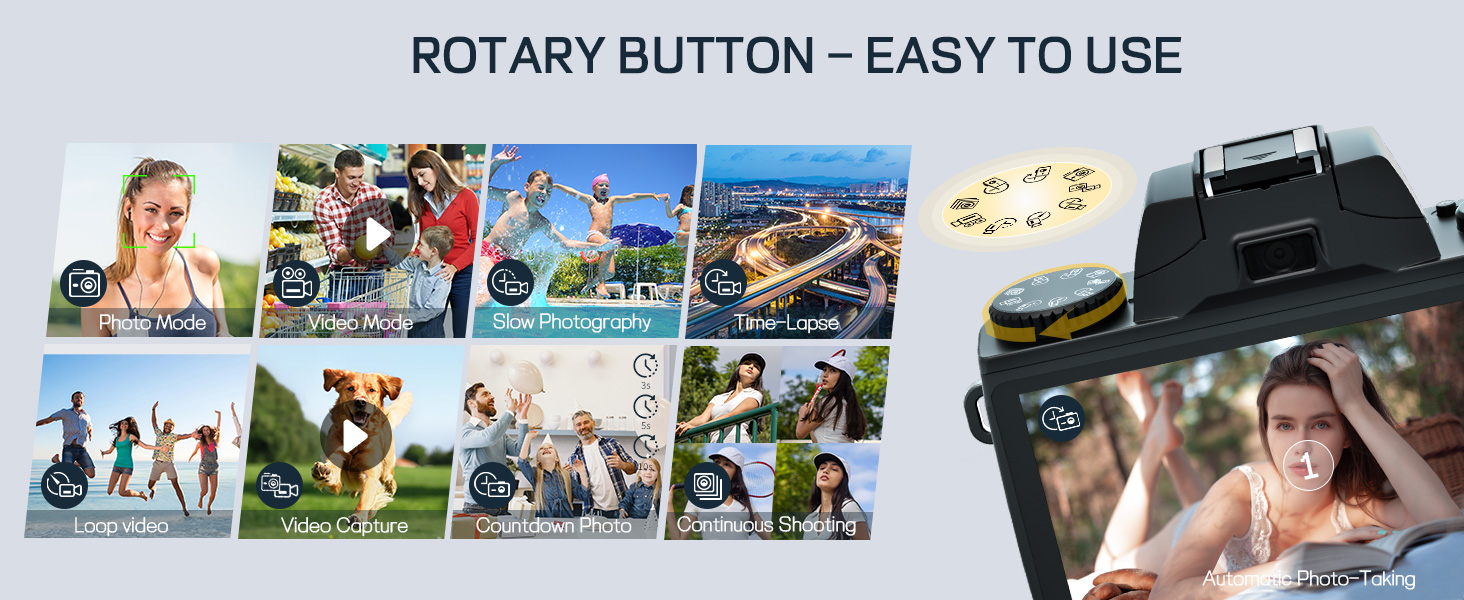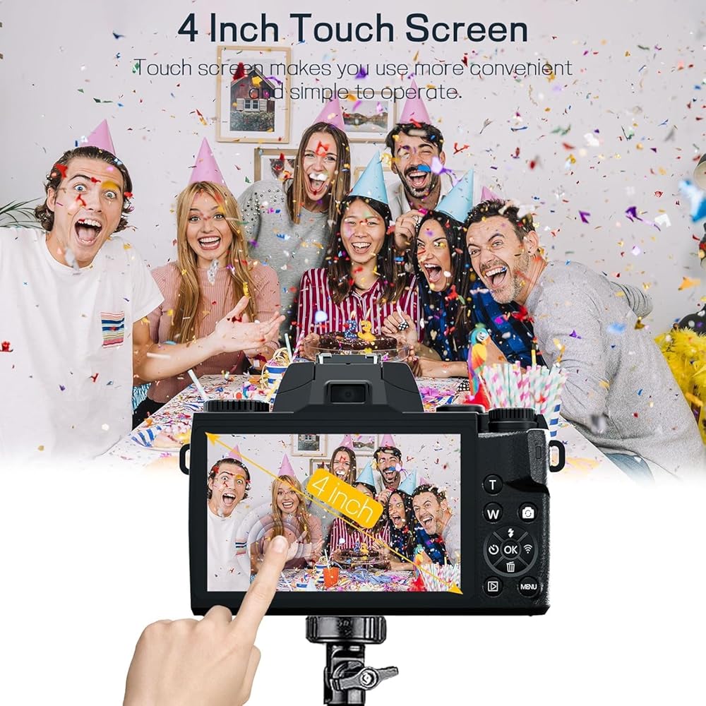 【شاشة تعمل باللمس وكاميرا ذات عدسة مزدوجة】تعتمد كاميرا التصوير الفوتوغرافي هذه على تصميم شاشة لمس كبيرة مقاس 4.0 بوصة، أو ضبط الإعدادات أو مراجعة اللقطات بنقرة واحدة. مزودة بكاميرات أمامية وخلفية، تسهل هذه الكاميرا التقاط صور السيلفي أو البث المباشر
