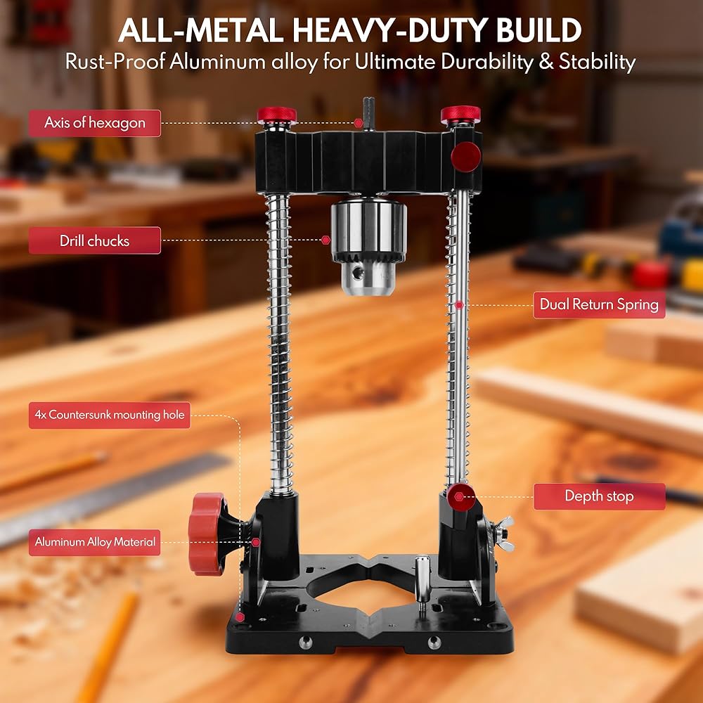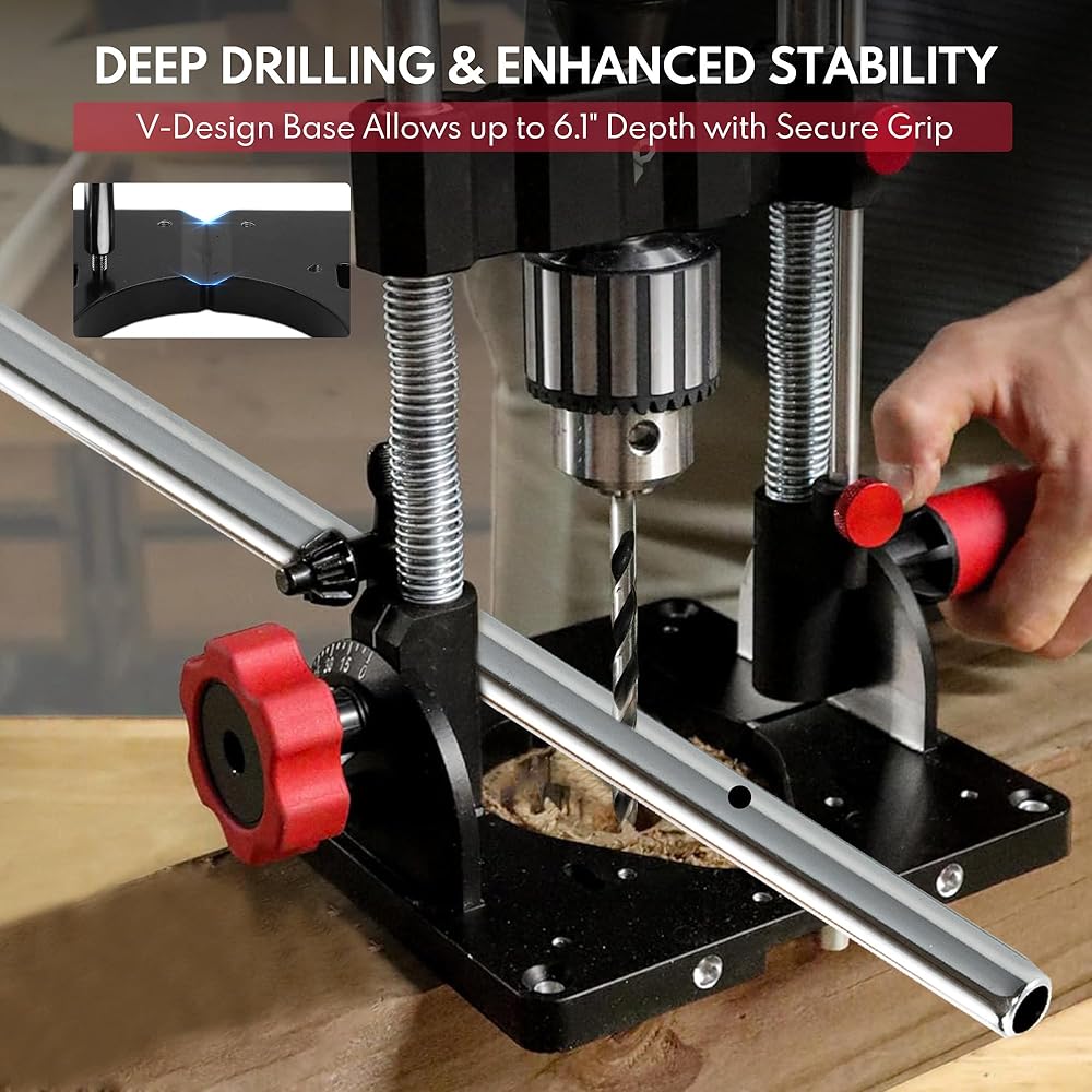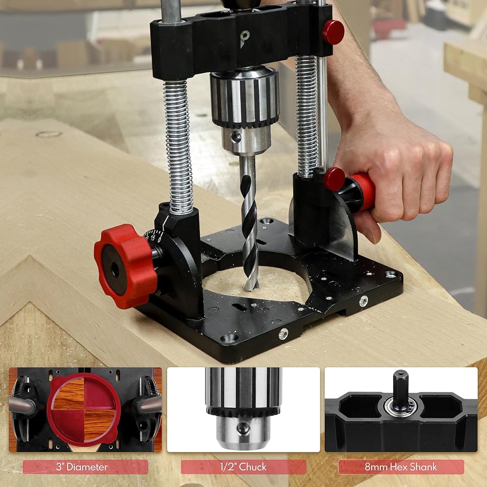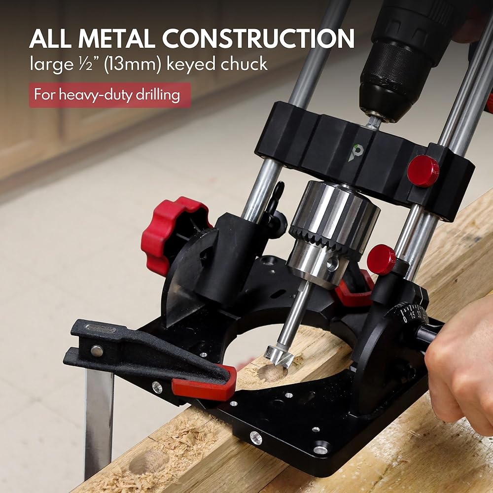 Portable Drill Guide & Drill Press Adapter, 0 to 60 Degree Adjustable Angle Guide, Heavy-Duty Construction with 1/2" Chuck for Hand Drill