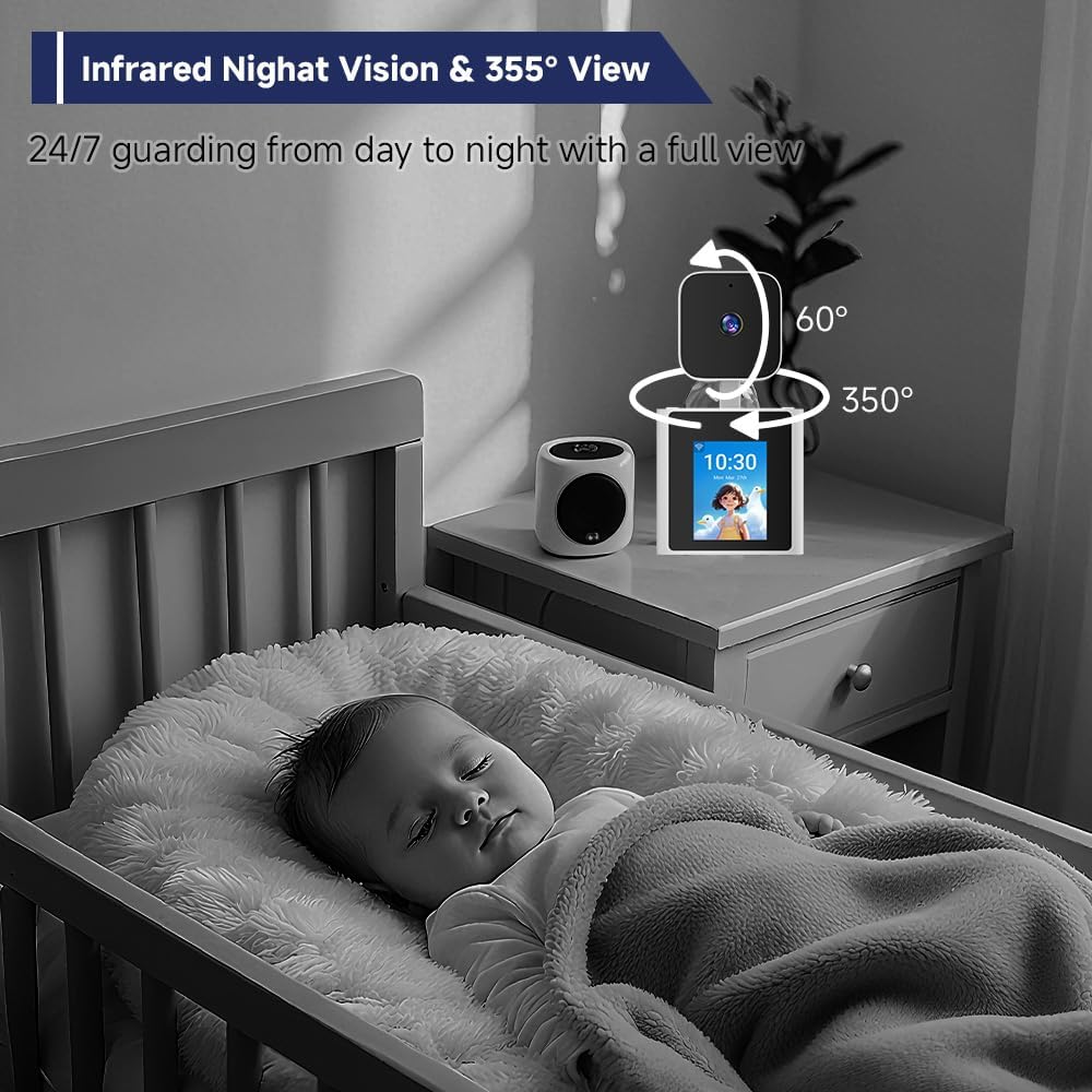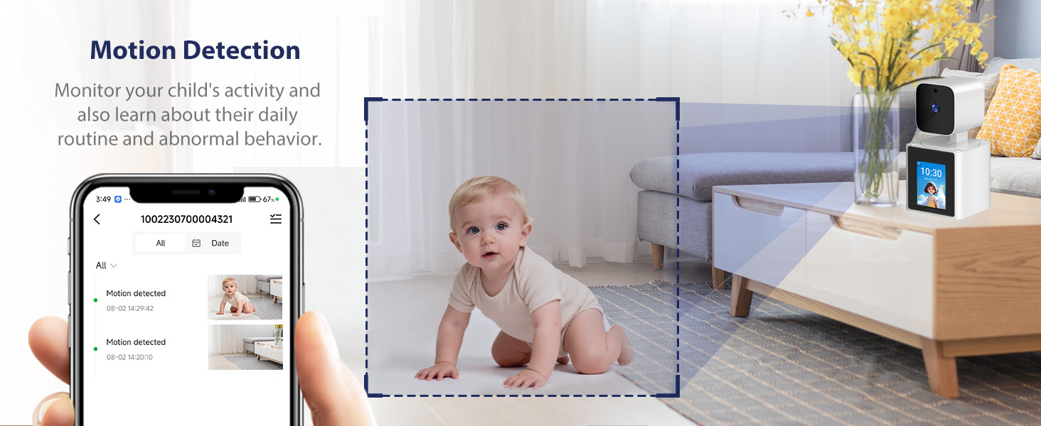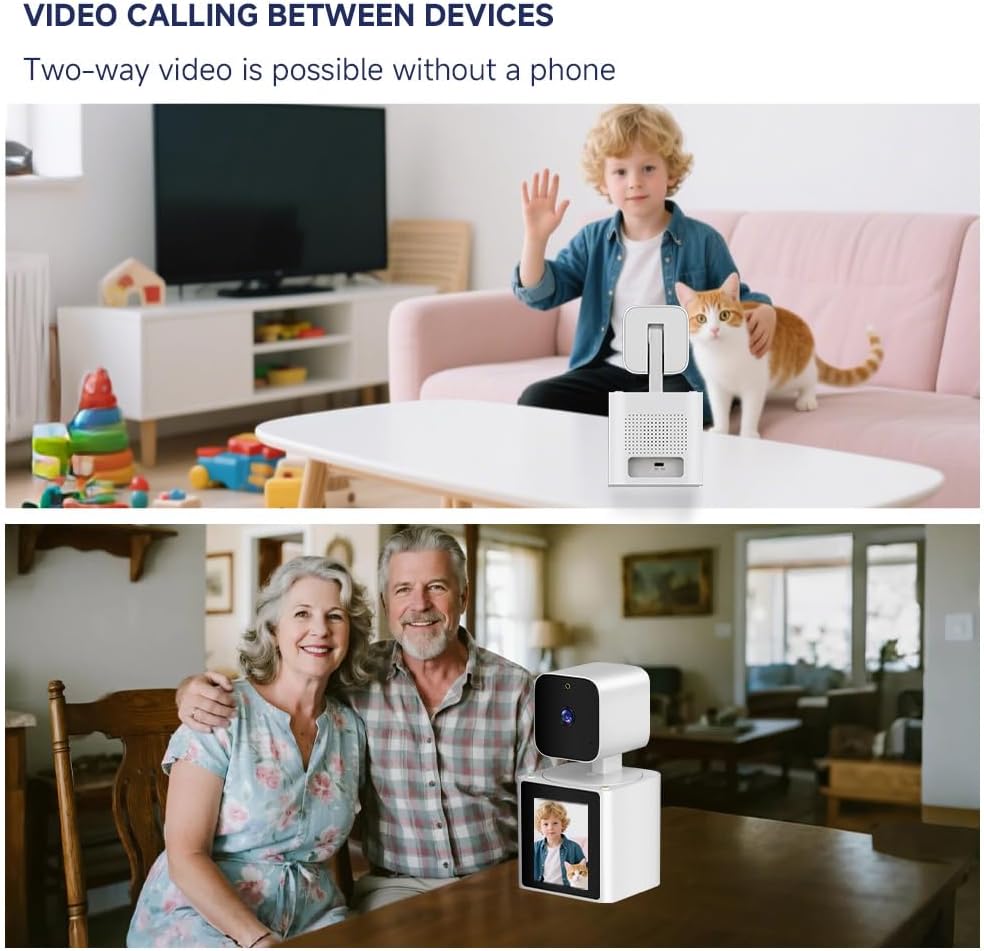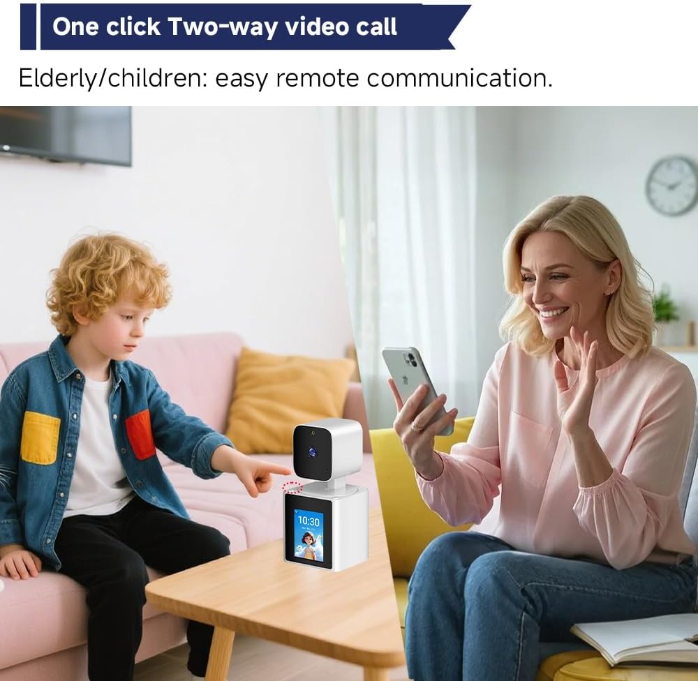 شاشة لمس 2.8 بوصة + عدسة 1080P HD: شاهد اللقطات الحية بوضوح على هاتفك، بينما تسمح الشاشة المدمجة لأفراد العائلة برؤيتك، مما يتيح التفاعل الدافئ وجهًا لوجه. إنه مثالي للتفاعل مع طفلك كجهاز مراقبة للأطفال أو التعامل مع حيواناتك الأليفة ككاميرا للحيوانات الأليفة.