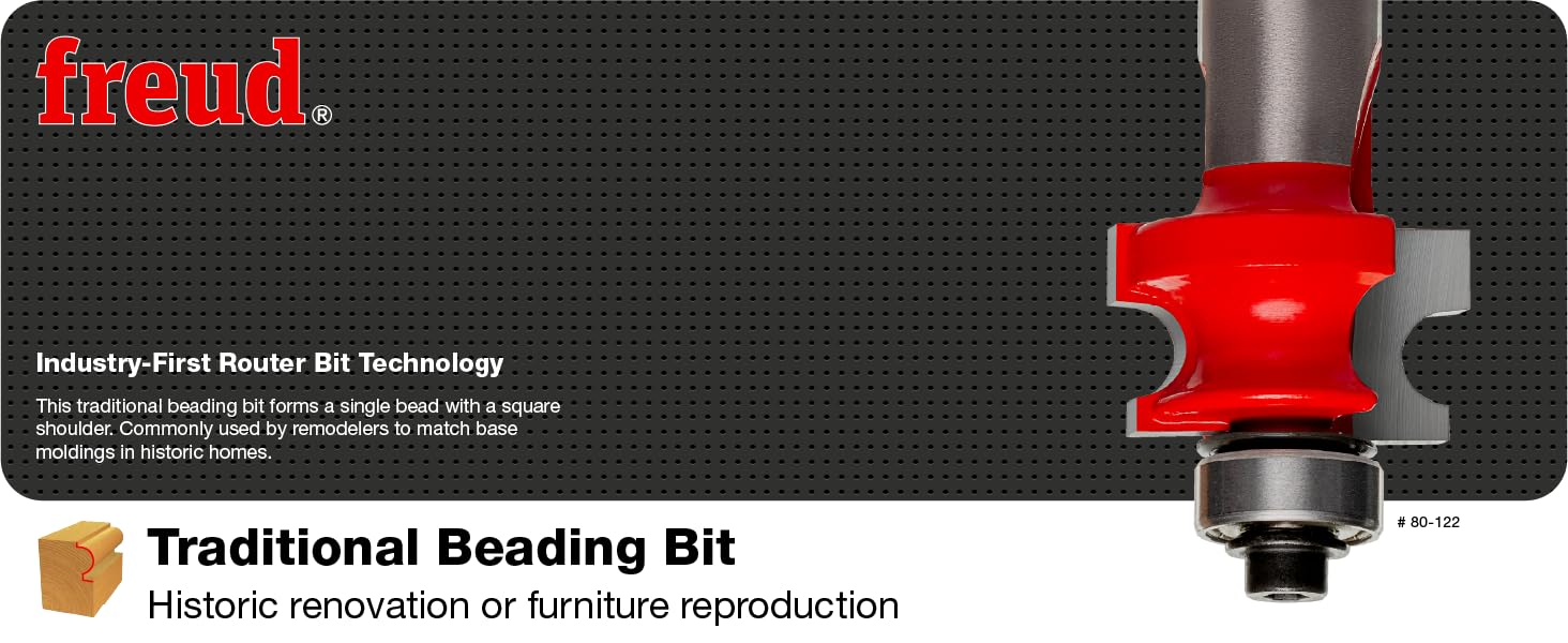 Freud's traditional beading bits will form a single bead with a square shoulder. These bits are used by many remodelers to match moldings in older houses. Covered by Freud's limited lifetime warranty.