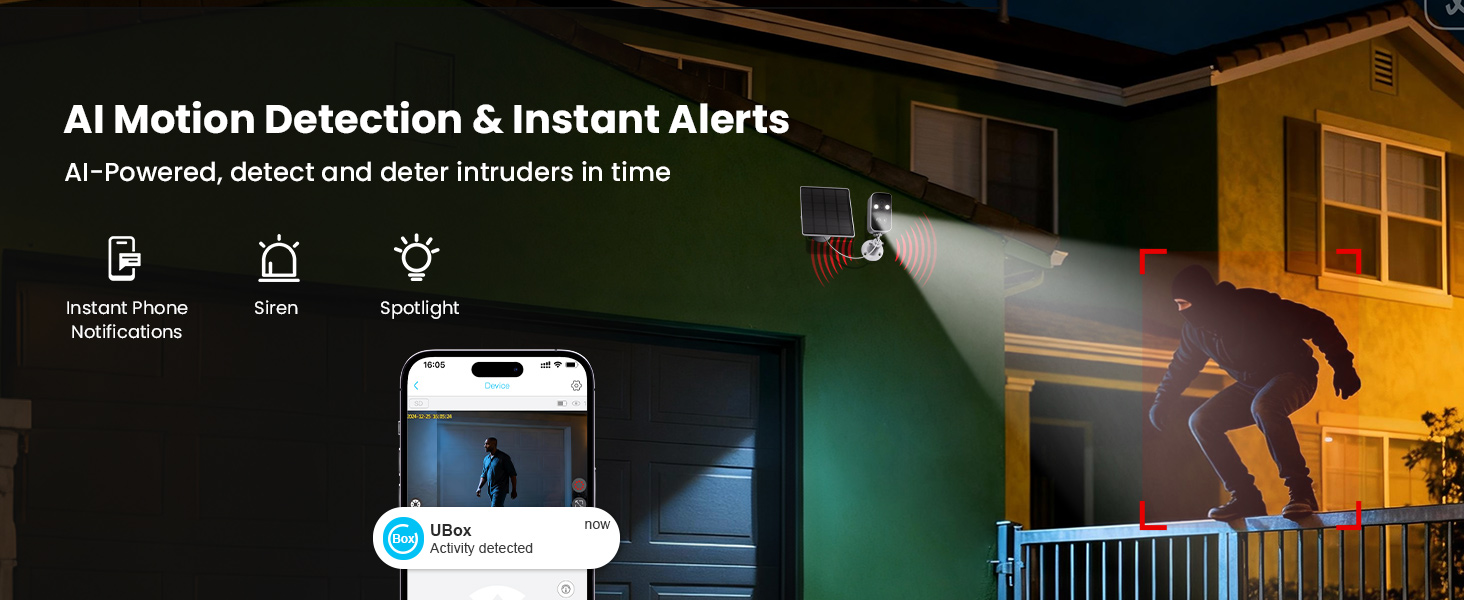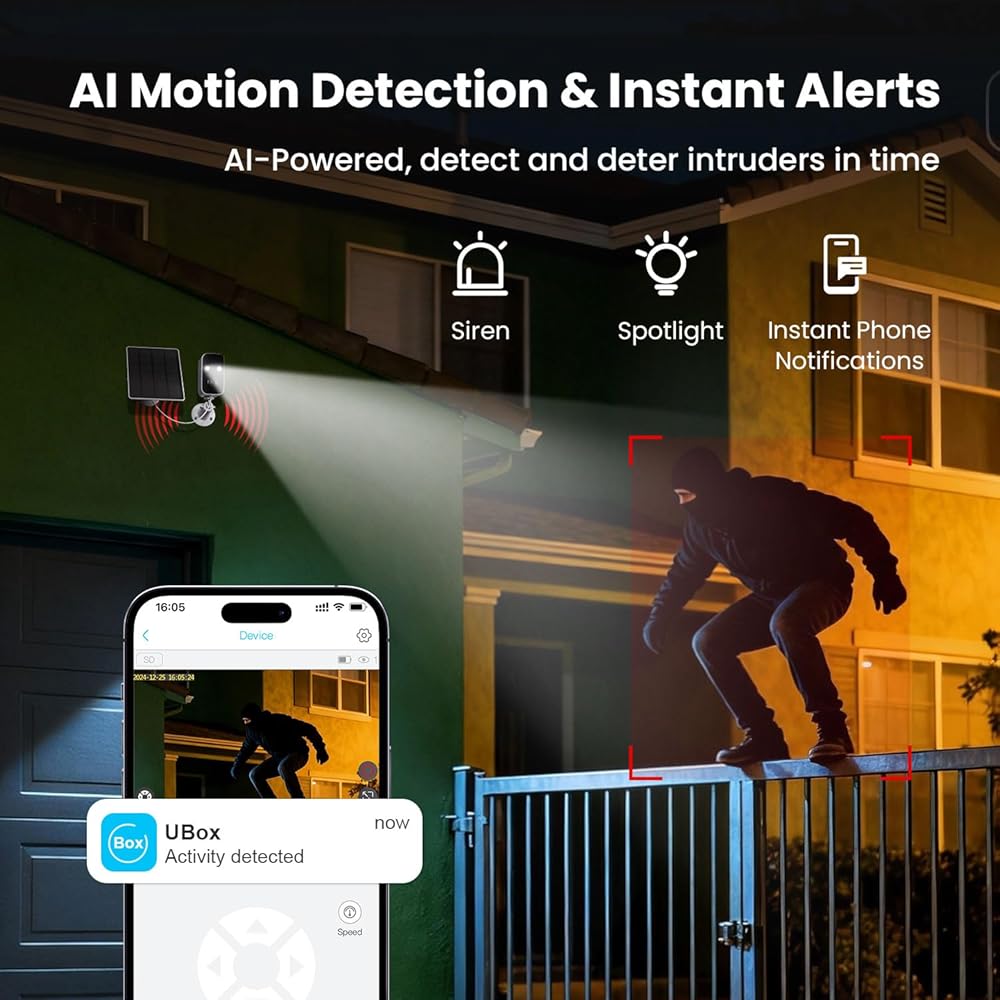 كشف الحركة بالذكاء الاصطناعي والتحذير في الوقت المناسب: عندما يكتشف مستشعر PIR الاحترافي الحركة، فإن كاميرا الأمان اللاسلكية الخارجية تبعث بسرعة ضوءًا أو تصدر صفارة الإنذار لتخويف الدخلاء. بينما يتم دفع إشعار فوري عبر الهاتف، مما يتيح لك أن تكون دائمًا على اطلاع.
