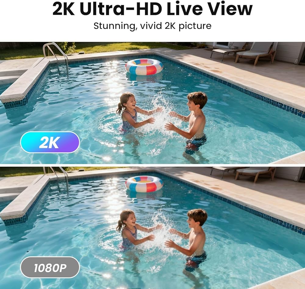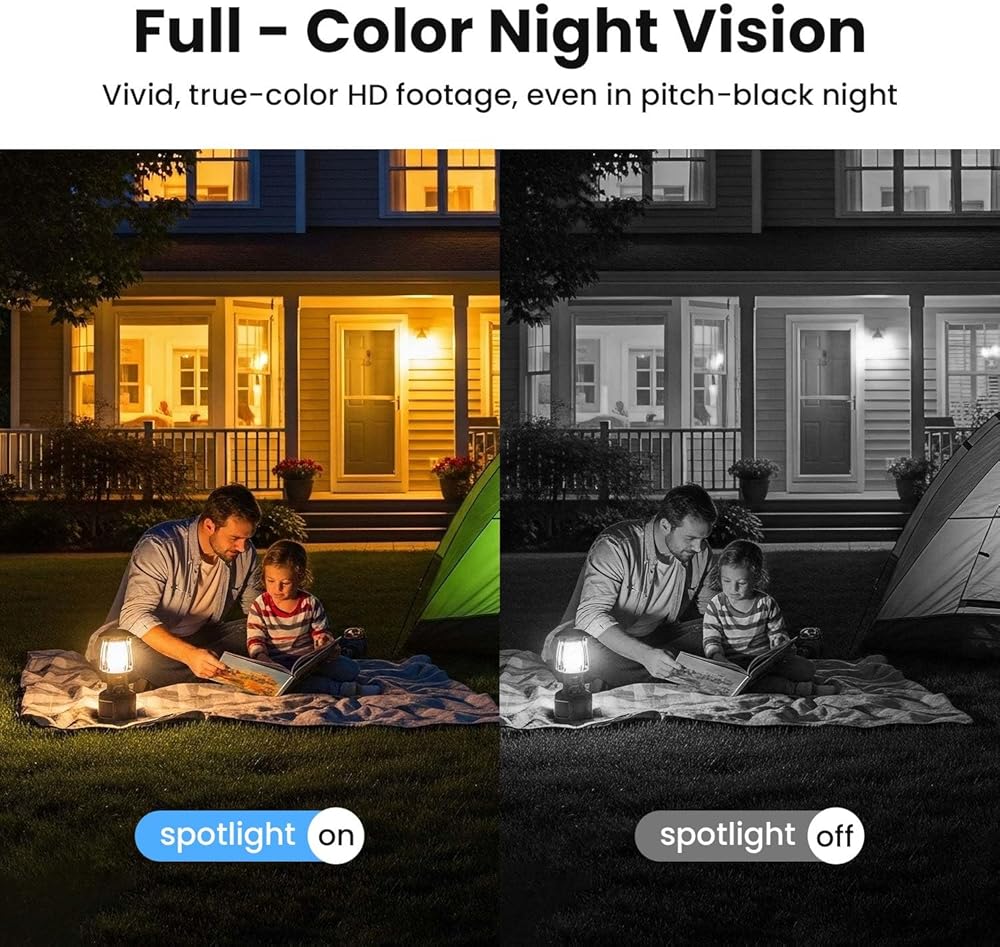 وضوح 2K Ultra HD للنهار والليل: استمتع بدقة 2K UHD وتكبير 4X للحصول على تفاصيل أكثر وضوحًا ووضوحًا محسنًا. بفضل الرؤية الليلية المتقدمة بالألوان الكاملة، تلتقط الكاميرات اللاسلكية لأمن المنزل صورًا واضحة وملونة تصل إلى 50 قدمًا، حتى في الظلام الدامس.