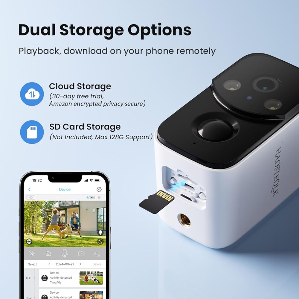 قم بتأمين الفيديو الخاص بك على وحدة تخزين مزدوجة: قم بتحميل تسجيلات الحركة إلى وحدة تخزين سحابية مشفرة أو احفظها على وحدة تخزين بطاقة SD المحلية (غير متضمنة)، وقم بتشغيلها/تنزيلها بسهولة على هاتفك حتى عندما تكون الكاميرا الشمسية الخارجية تالفة أو مفقودة.