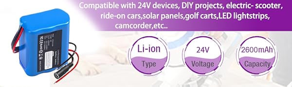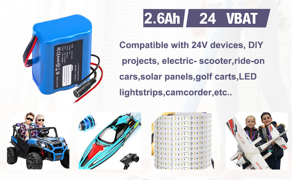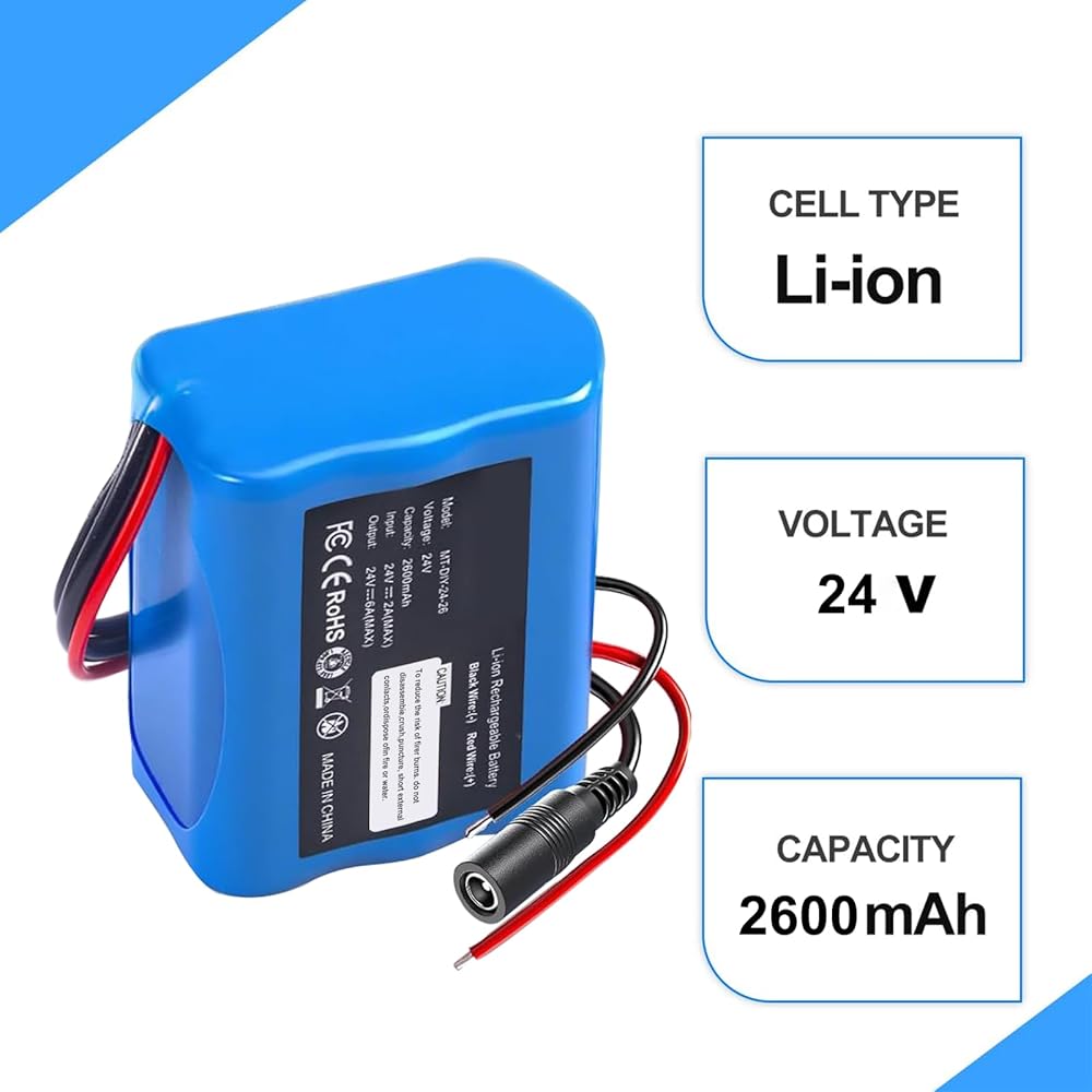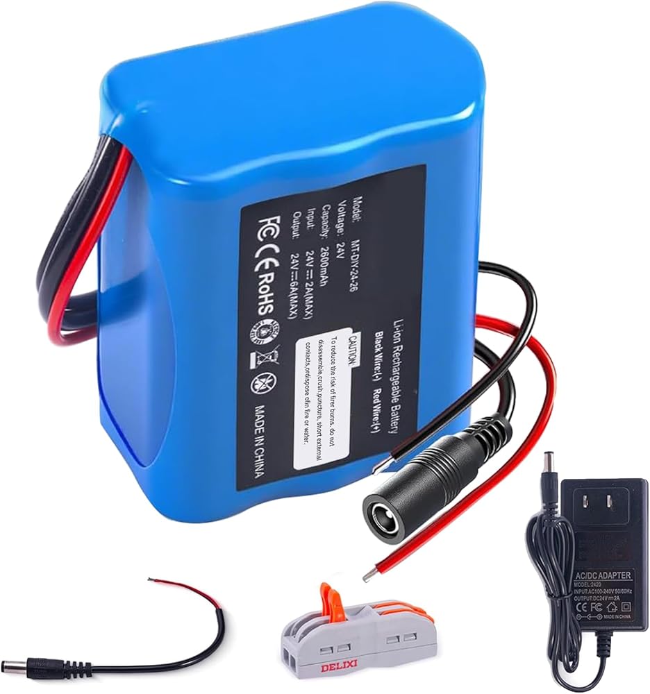 حزمة واحدة 24 فولت 2.6 أمبير في الساعة بطارية ليثيوم ذاتية الصنع، مشروع DIY قابل للتطبيق، سيارة RC، روبوت، ألواح شمسية، شريط إضاءة LED، كاميرا CCTV، إلخ، مع شاحن، سلك موصلات عارية، موصل كابل للأطفال في السيارات