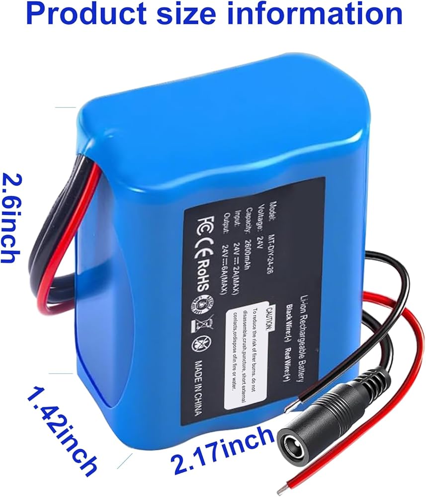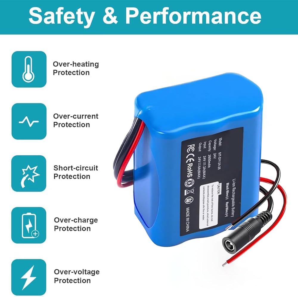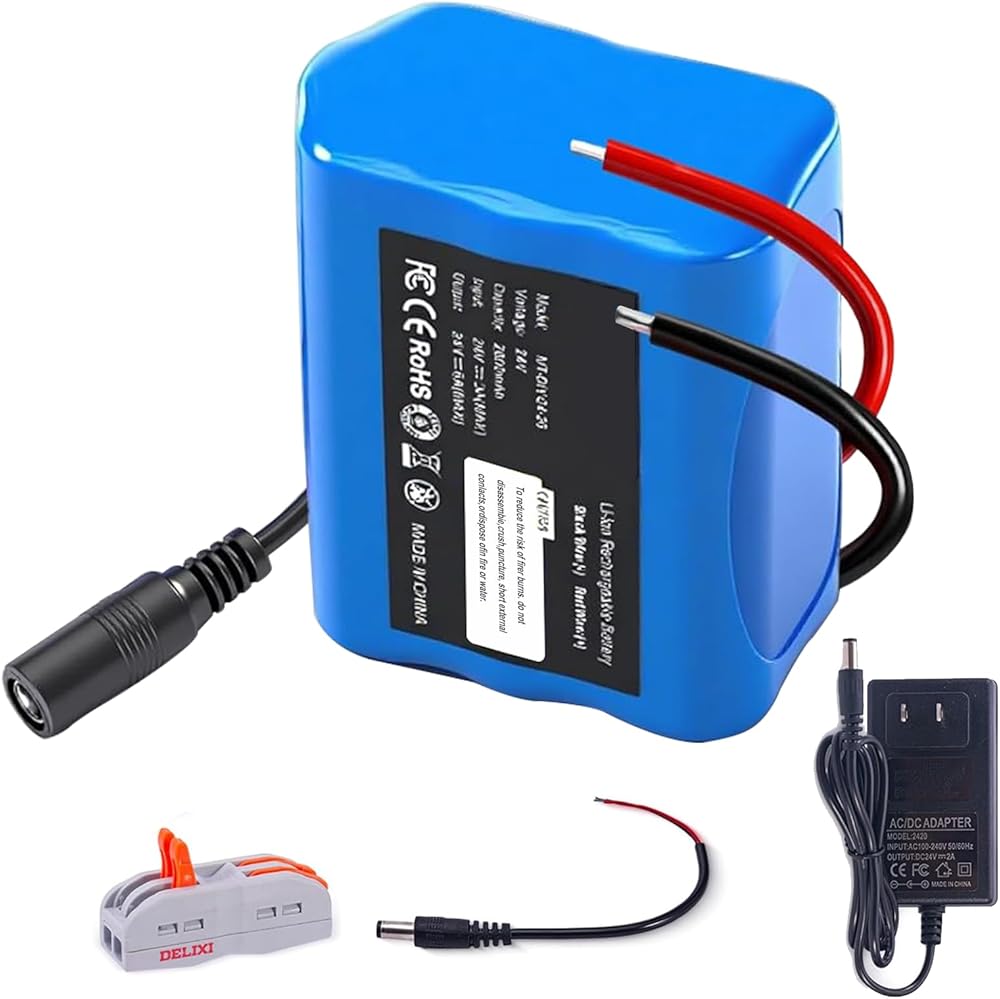 • 【خدمة الدعم】 يمكنك الحصول على حزمة بطارية 1 × 24 فولت، و1 × شاحن بطارية، و1 × موصل كابل و1 × سلك تمديد DC5521. خدمة جودة المنتج لمدة 24 شهرًا وخدمة عملاء ودودة على مدار 24 ساعة!