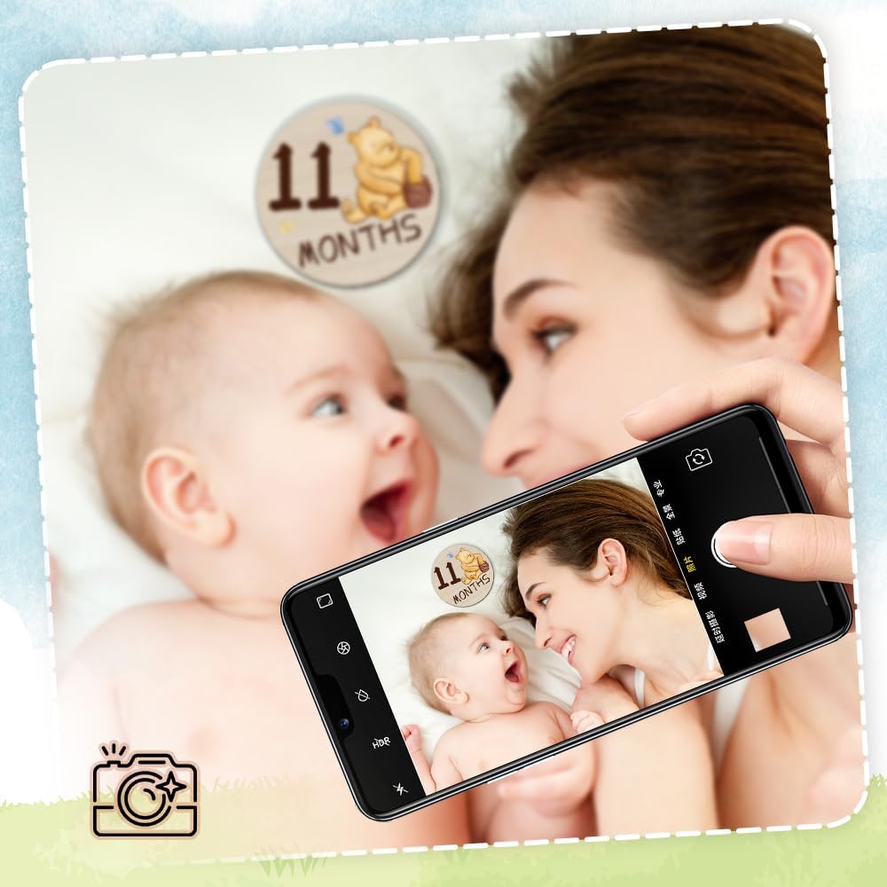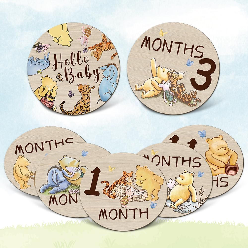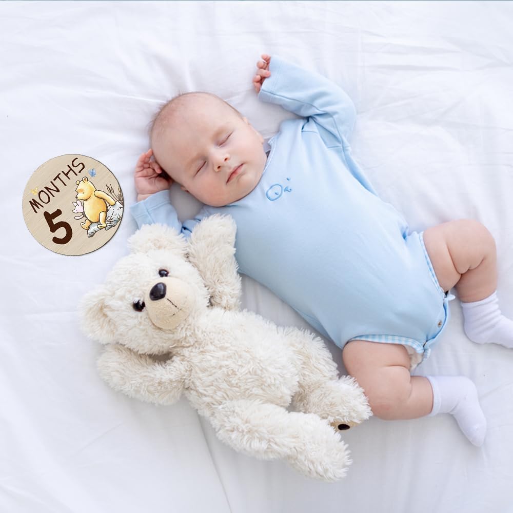 7 قطع من دوائر المعالم الشهرية من ويني بيبي، أقراص خشبية على شكل دب للأطفال من أجل طفلة رضيعة، لافتات دائرية مزدوجة الجوانب لدعم صور حديثي الولادة