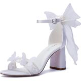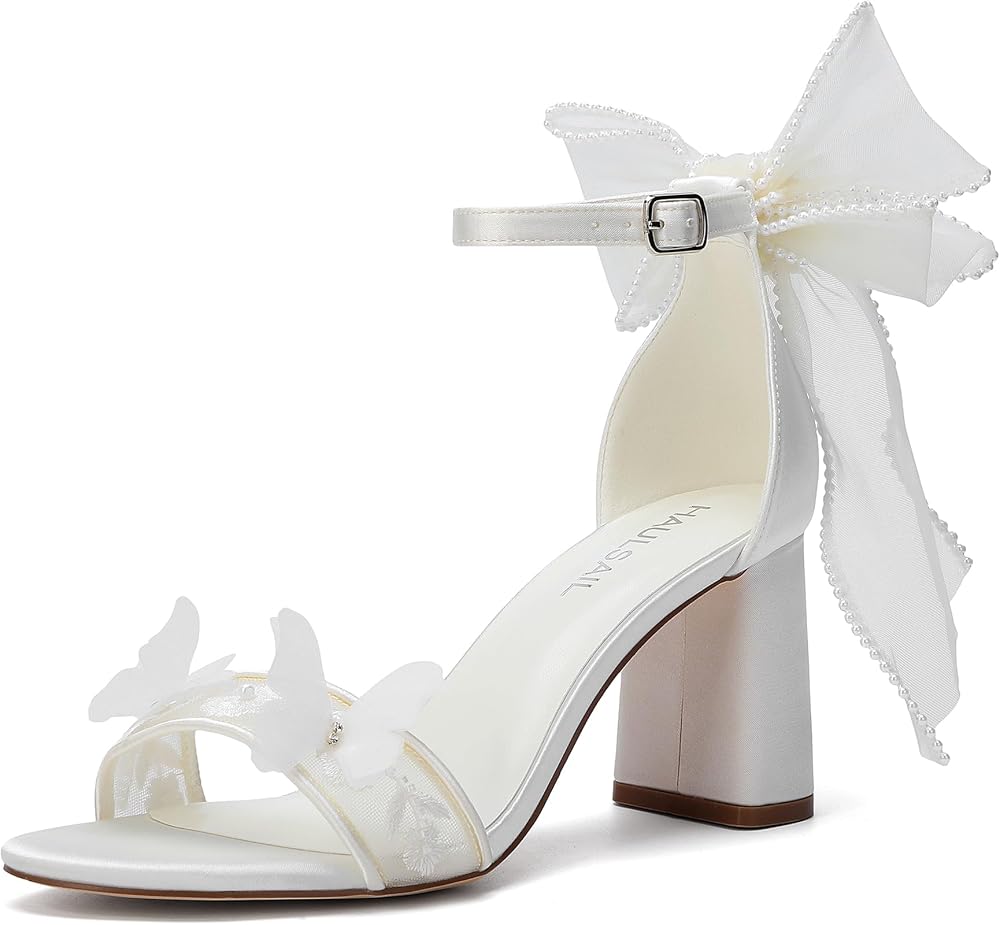 ELEGANT DESIGN: White satin sandals with pearl-trimmed bow and butterfly accents, featuring a 3.15-inch block heel and open-toe design perfect for weddings and formal occasions