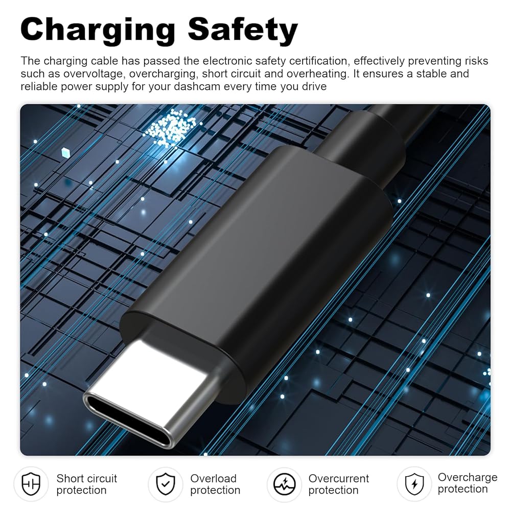 Safe Charging: This dashcam charging cable has passed electronic safety certification, effectively protecting against overvoltage, overcharging, short circuits, and overheating risks. It ensures stable and reliable power supply to your dashcam during every drive