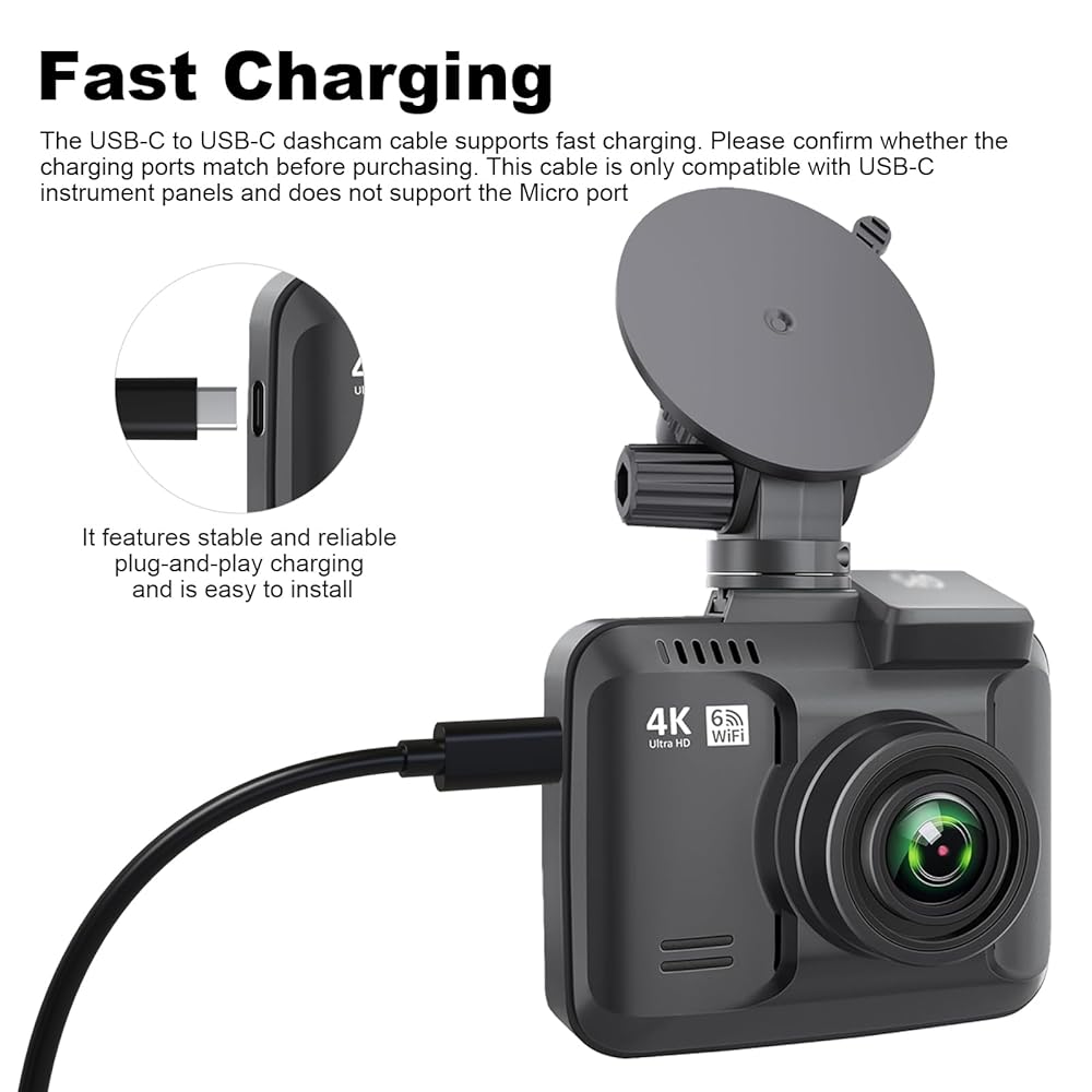 Fast Charging: The USB-C to USB-C Dash Cam cord supports fast charging, Before purchasing, please confirm that the charging ports match. This cable is only compatible with USB-C dashcams and does not support Micro ports