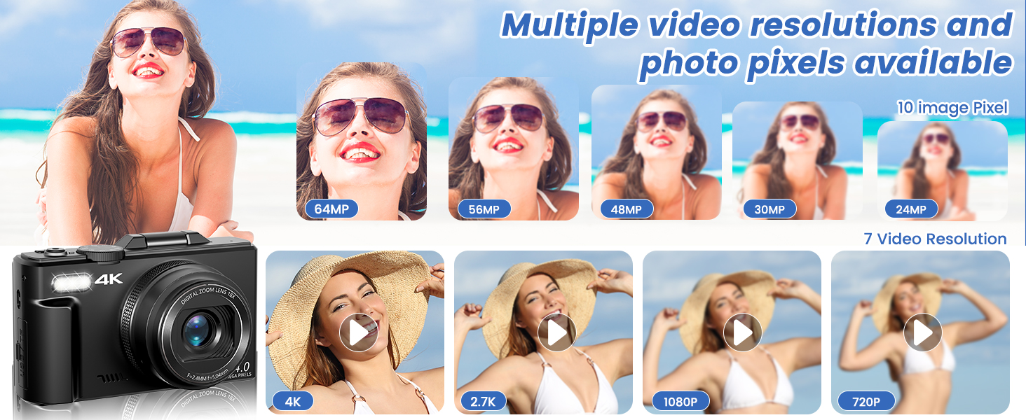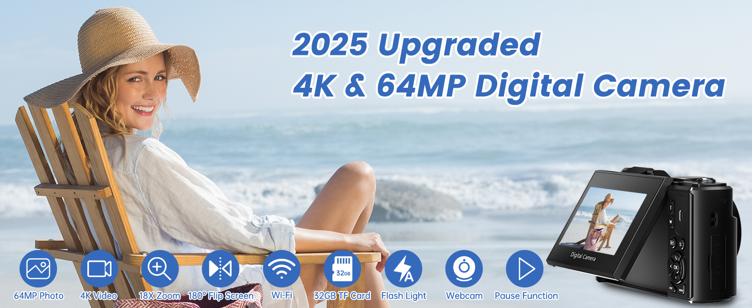 【كاميرا رقمية ذات تركيز تلقائي بدقة 4K بدقة 64 ميجابكسل】يمكن لكاميرا التصوير الفوتوغرافي بدقة 4K ترقية 2024 التقاط صور بدقة 64 ميجابكسل وتسجيل دقة فيديو بدقة 4K (30 إطارًا في الثانية). تدعم كاميرا مدونة الفيديو الفاصل الزمني والحركة البطيئة والتسجيل الحلقي، مما يوفر لك تجربة تصوير غنية
