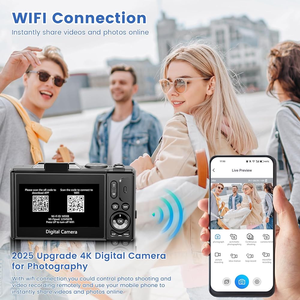 【كاميرا رقمية 4K مع واي فاي】يمكن لكاميرا الصور هذه المزودة بوظيفة واي فاي تحويل هاتفك الذكي إلى جهاز تحكم عن بعد لاسلكي ومشاركتها على Facebook وTiktok وغيرها من منصات الوسائط الاجتماعية في أي وقت، ومشاركتها مع أصدقائك في المرة الأولى.