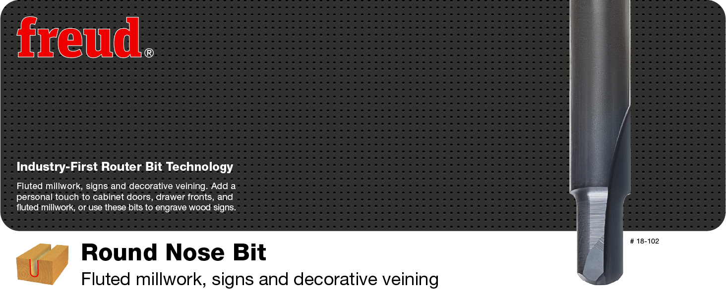 Freud Round Nose Bits, also known as "Core Box" bits, are perfect for adding beautiful engraved details to cabinet doors, drawer fronts, and fluted millwork, making them an excellent choice for routing sign lettering. These versatile tools can be used in CNC, hand-held, or table-mounted routers, cutting through hardwood, softwood, plywood, and composite materials with ease. Freud's Round Nose Bits feature a Black I.C.E. (Industrial Cooling Element) coating that keeps the cutting edge cool and enhances chip evacuation for smoother cuts. Combined with Freud's TiCo Hi-Density Carbide, these bits provide up to 2X longer life and superior performance compared to standard uncoated bits, making them a durable and reliable choice for professional woodworking.