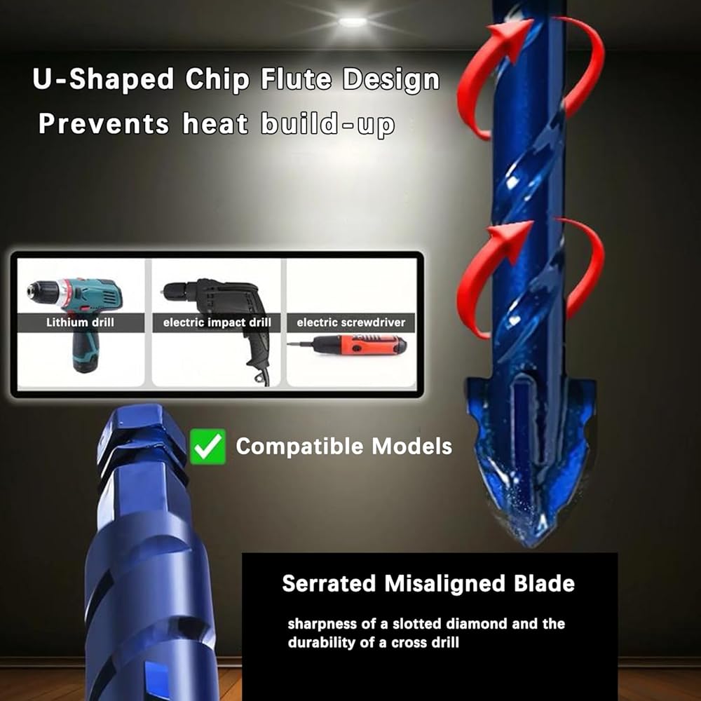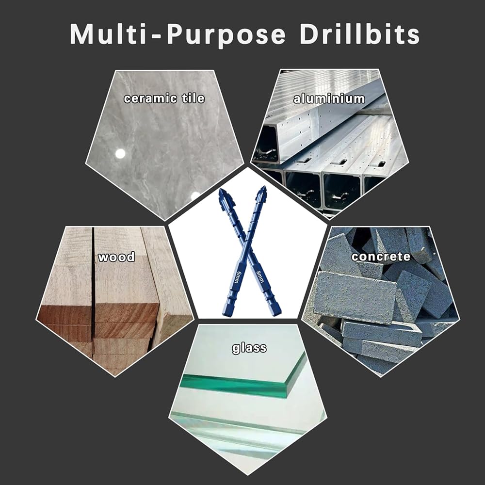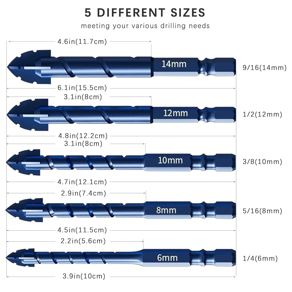 Unique Serrated Design: This upgraded masonry drill bit set includes 5 pieces in various sizes (1/4X3、5/16X2、3/8X1、1/2X1、9/16X1) suitable for drilling into tile, glass, brick, concrete, ceramic, plastic, and wood