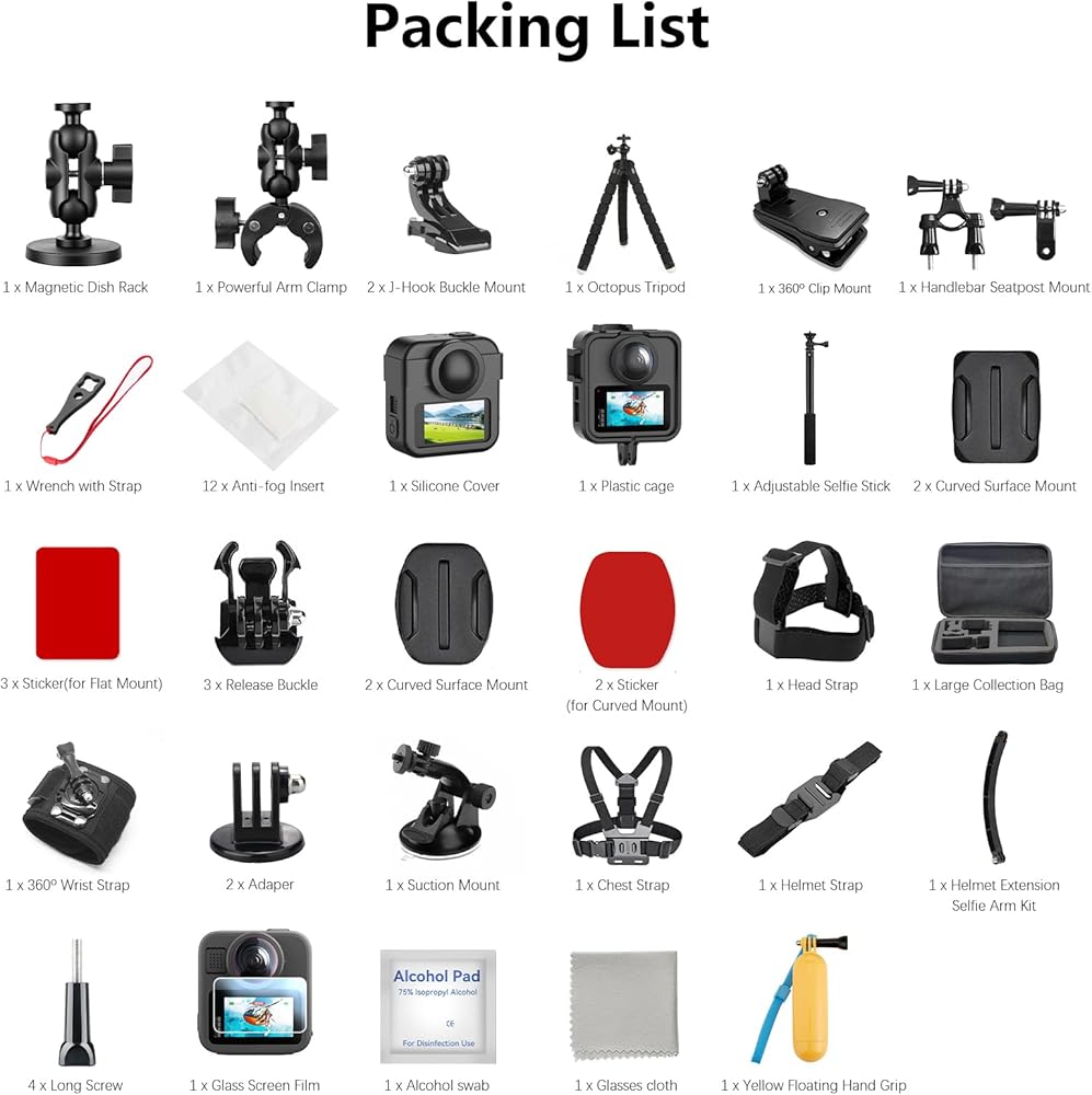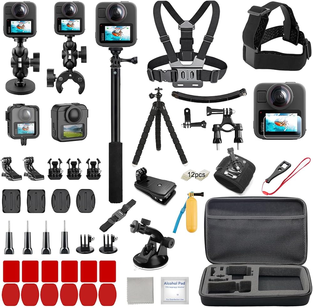 مجموعة ملحقات 60 في 1 متوافقة مع كاميرا GoPro Max 2 مع حافظة مقاومة للماء بطول 70 مترًا، وواقي شاشة من الزجاج المقسى، ومقبض بوبر عائم، وحقيبة حمل كبيرة، تثبت على الصدر/الرأس/المقود (بحد أقصى 2)