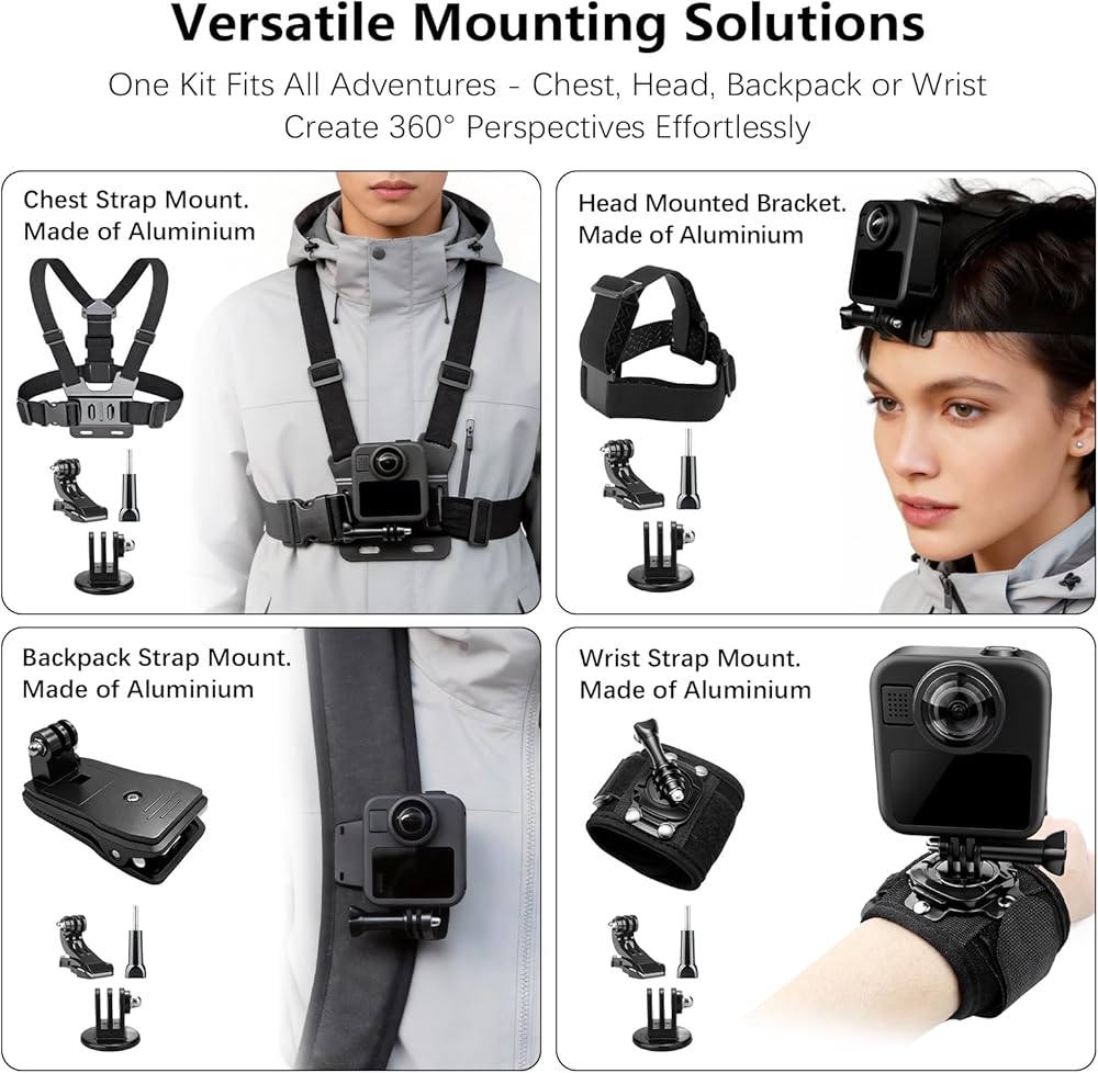 Multi-Angle Mounting System for POV Shots: Capture jaw-dropping first-person footage with the adjustable head strap, chest harness, and helmet mount (fits all sizes). The 360° rotatable wrist strap adds flexibility for unique angles, while the handlebar/pole mount ensures steady recording during biking, skiing, or motorbiking