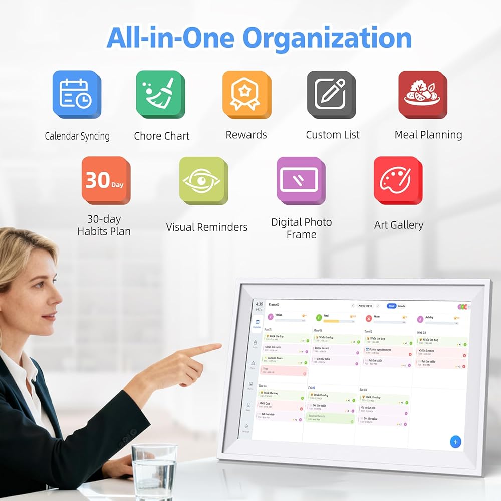 تقويم رقمي 15.6 بوصة شاشة لمس حائطية مخطط إلكتروني ومخطط عمل، عرض تفاعلي للتقويمات الذكية للعائلة لتنظيم الروتين وجداول الوجبات مع إطار صورة رقمي