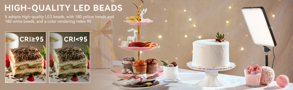 • 【اللون والسطوع قابلان للتعديل】 تتوفر ثلاث درجات حرارة للألوان: 2900 كلفن، 4400 كلفن، و7000 كلفن. يمكن تعديل السطوع من 10% إلى 100%، مما يمكن أن يخلق أجواء إضاءة مختلفة لك. يتميز هذا المصباح بـ 360 خرزة LED عالية السطوع، مما يوفر إضاءة أكثر وفرة. ويضمن تصميمه المسطح إضاءة أكثر تساويًا، ومع ارتفاع مؤشر CRI لأكثر من 95، يكون لون الضوء أقرب إلى الجسم الحقيقي.