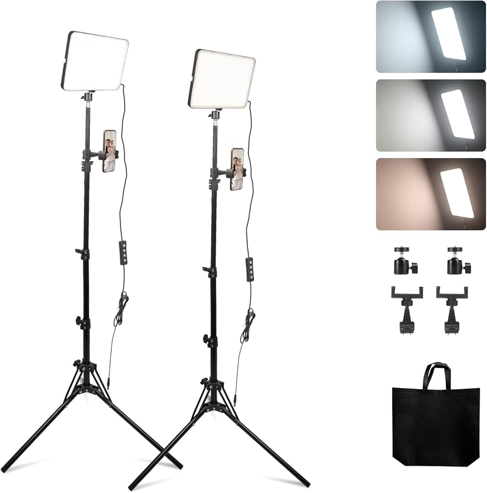 مجموعة من قطعتين من مصابيح فيديو LED، مصابيح استوديو، قوة 24 وات، إضاءة تصوير فوتوغرافي قابلة للتعتيم 2900 ~ 7000 كلفن، حامل ثلاثي الأرجل وحامل هاتف، يمكنها تسجيل الحياة وتصوير مقاطع الفيديو والصور (PD360C) in Kuwait