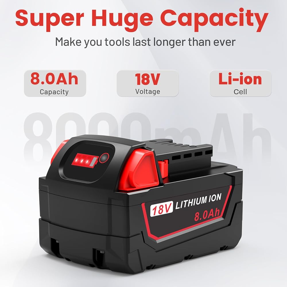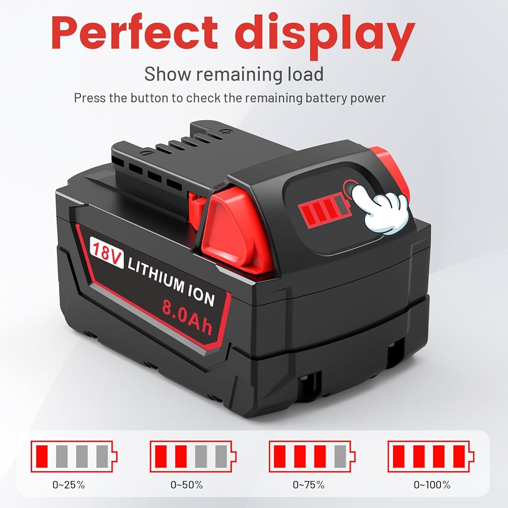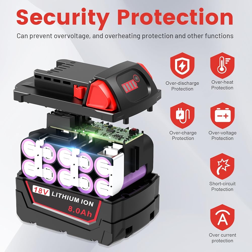 نظام السلامة: استبدال بطارية ميلووكي 18 فولت خلايا بطارية ليثيوم أيون ممتازة مدمجة توفر شحنًا سريعًا واستهلاكًا منخفضًا للطاقة، لا يوجد تأثير على الذاكرة، حماية ذكية ضد الأضرار المحتملة الناجمة عن الشحن الزائد، والتفريغ الزائد، والجهد الزائد، والتيار الزائد، والدائرة القصيرة