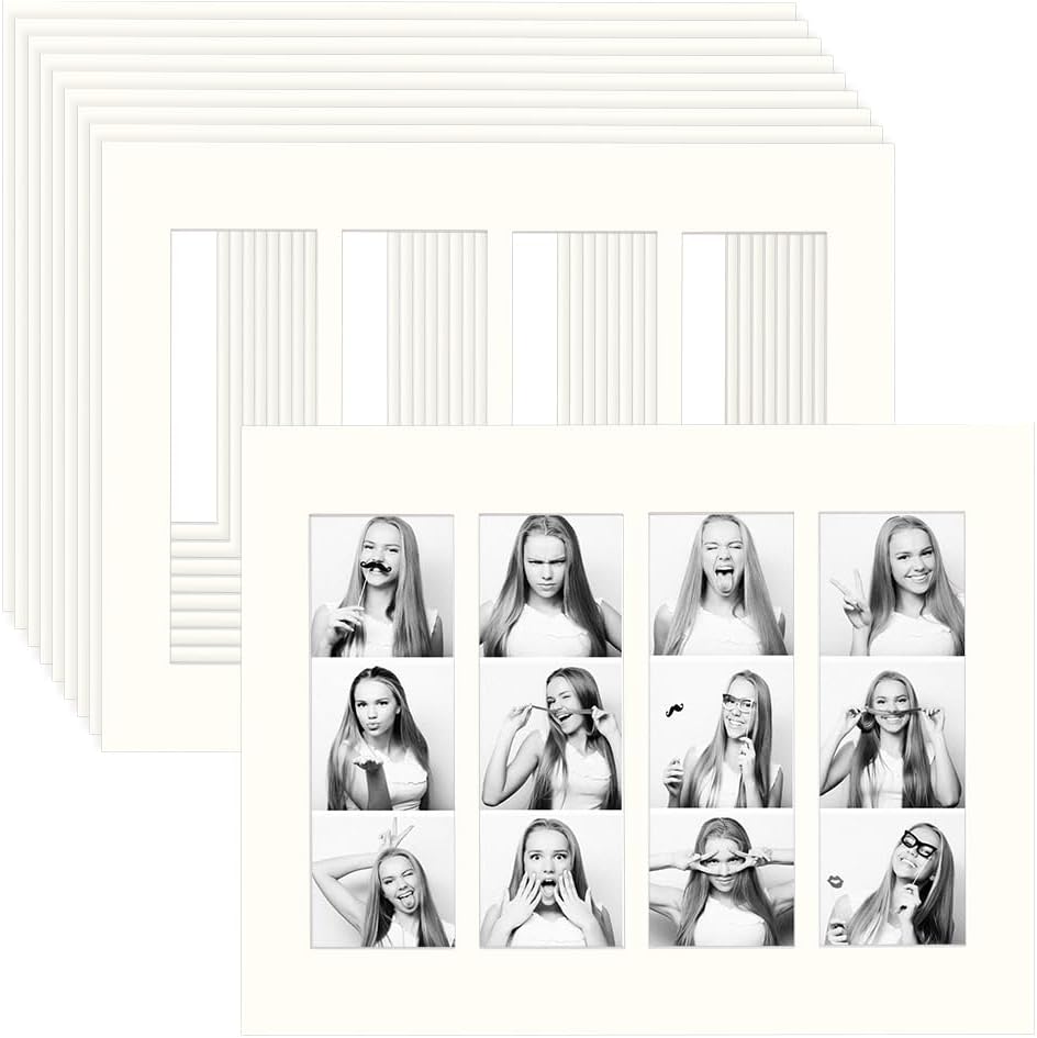 Package : 10 pack art mats for Framing with pre-cut 4-hole photo mat board, ready to use without extra cutting. Pair with frames to easily mount 4pcs 6x2 inch photos, organize photo booth strips quickly, and prevent photos from getting lost—ideal for family or party bulk display needs