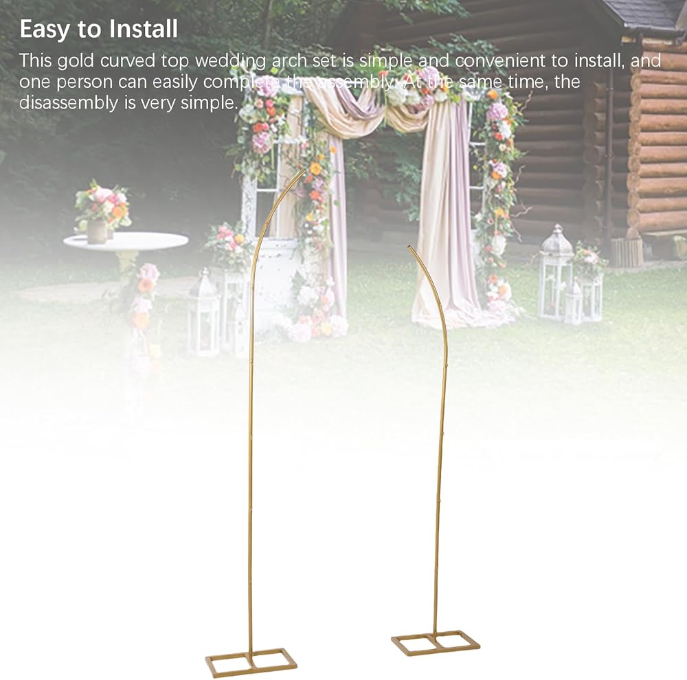 • [SIMPLE AND QUICK ASSEMBLY] Setting up this gold curved top wedding arch is a breeze with its user friendly design. One person can effortlessly assemble and disassemble the stand without any tools required. The intuitive structure ensures a hassle free experience allowing you to focus on decorating and enjoying your event.