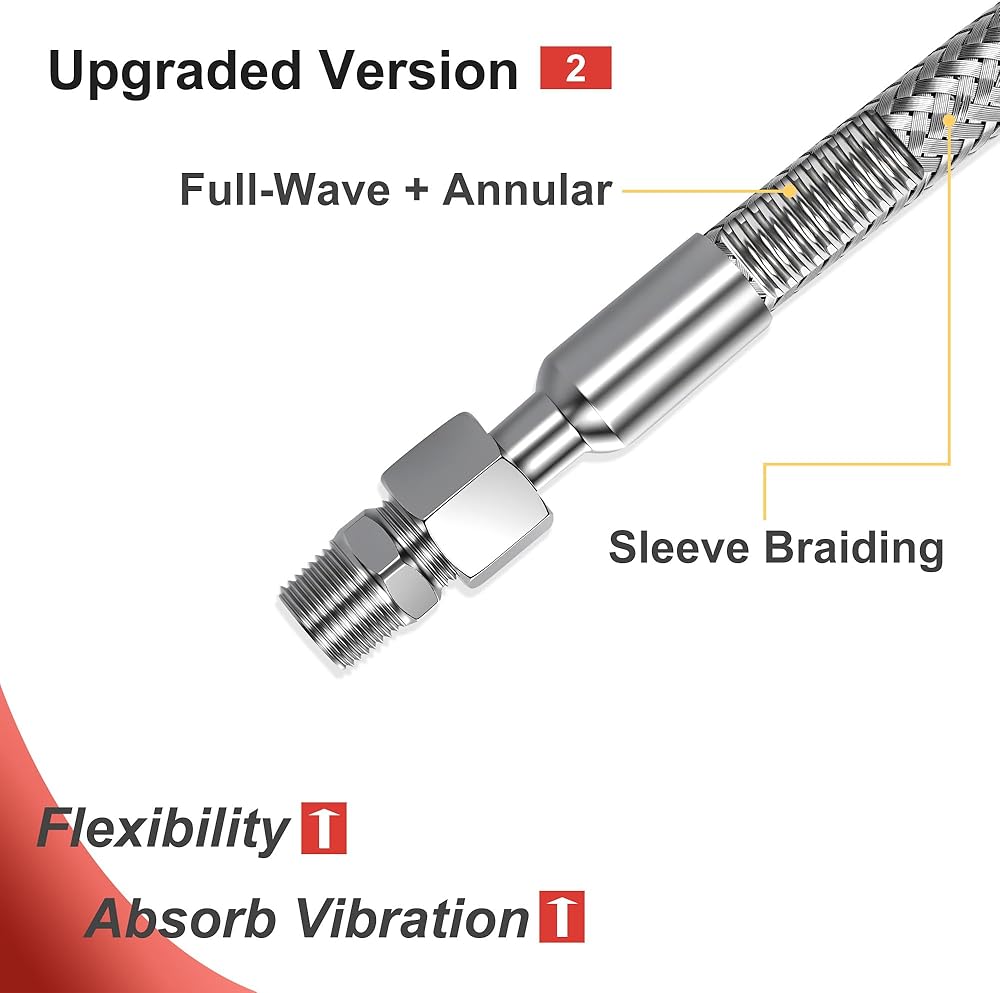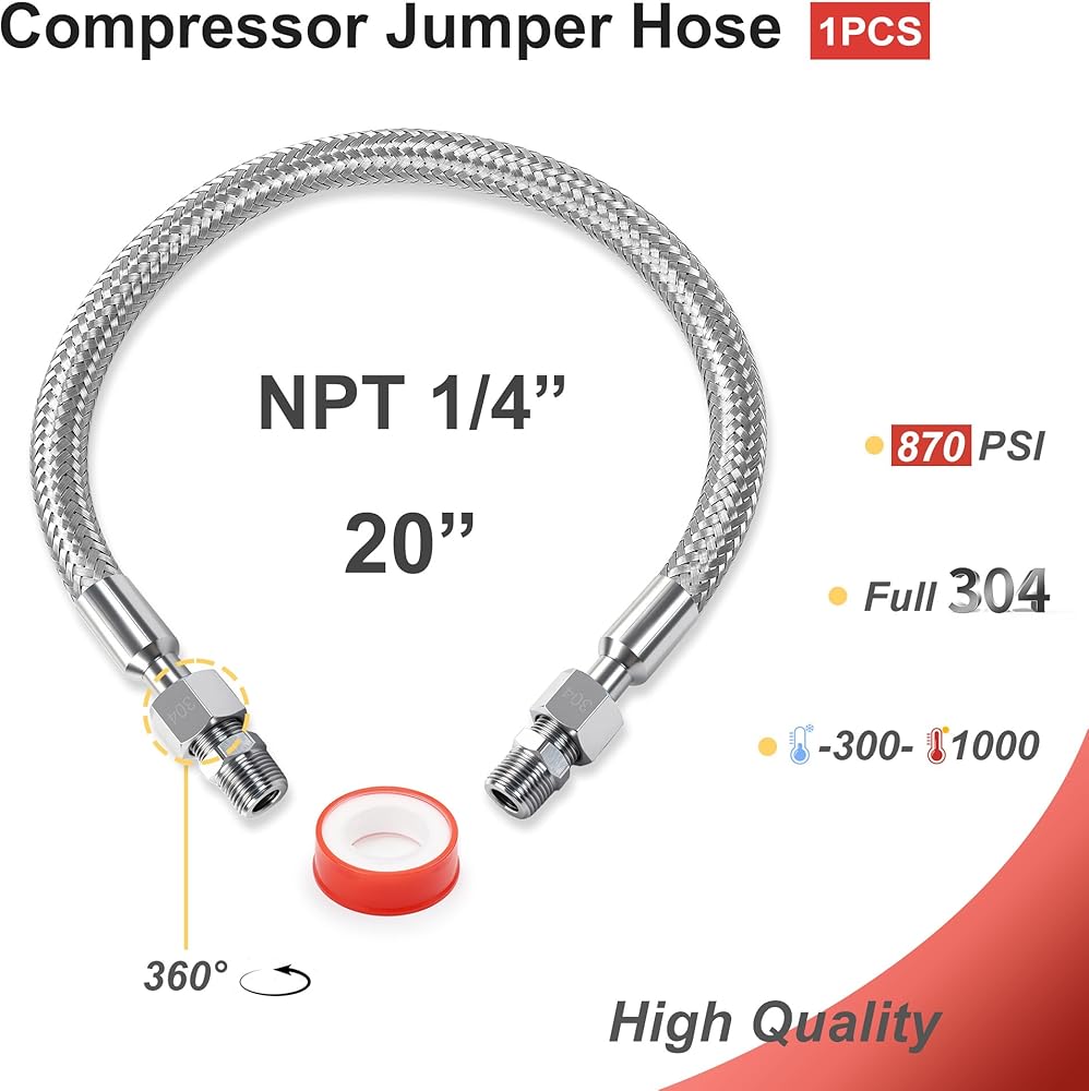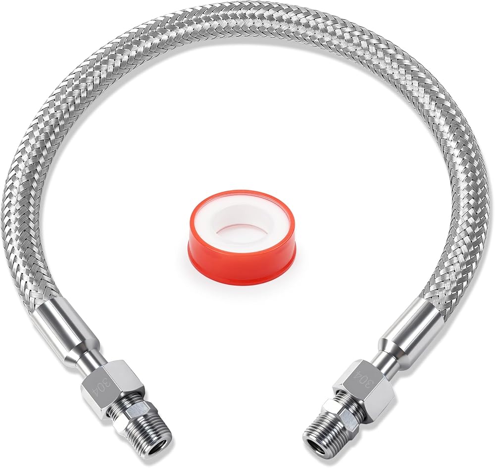 ما هو متضمن - 1 × 1/4 بوصة × 20 بوصة خرطوم قافز مجدول من الفولاذ المقاوم للصدأ مع أطراف ذكر دوارة مقاس 1/4 بوصة NPT + 1 × لفة شريط لاصق PTFE