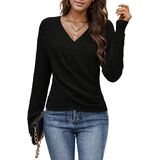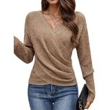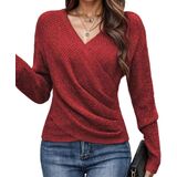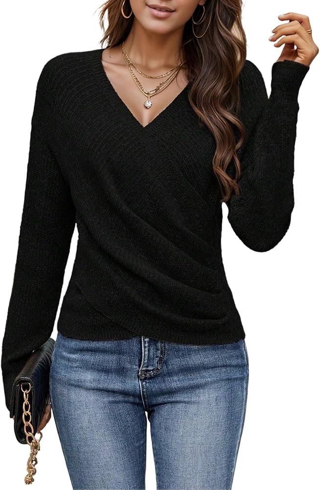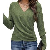 DIKGROP Women's V Neck Cross Wrap Pullover, Long Sleeve Ribbed Knit Sweater Casual Ruched Slim Fit Going Out Tops