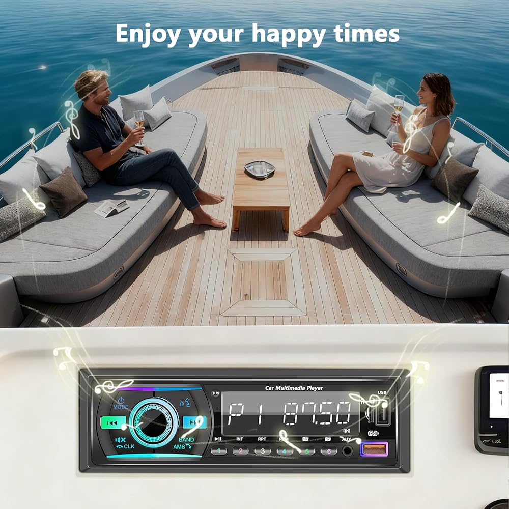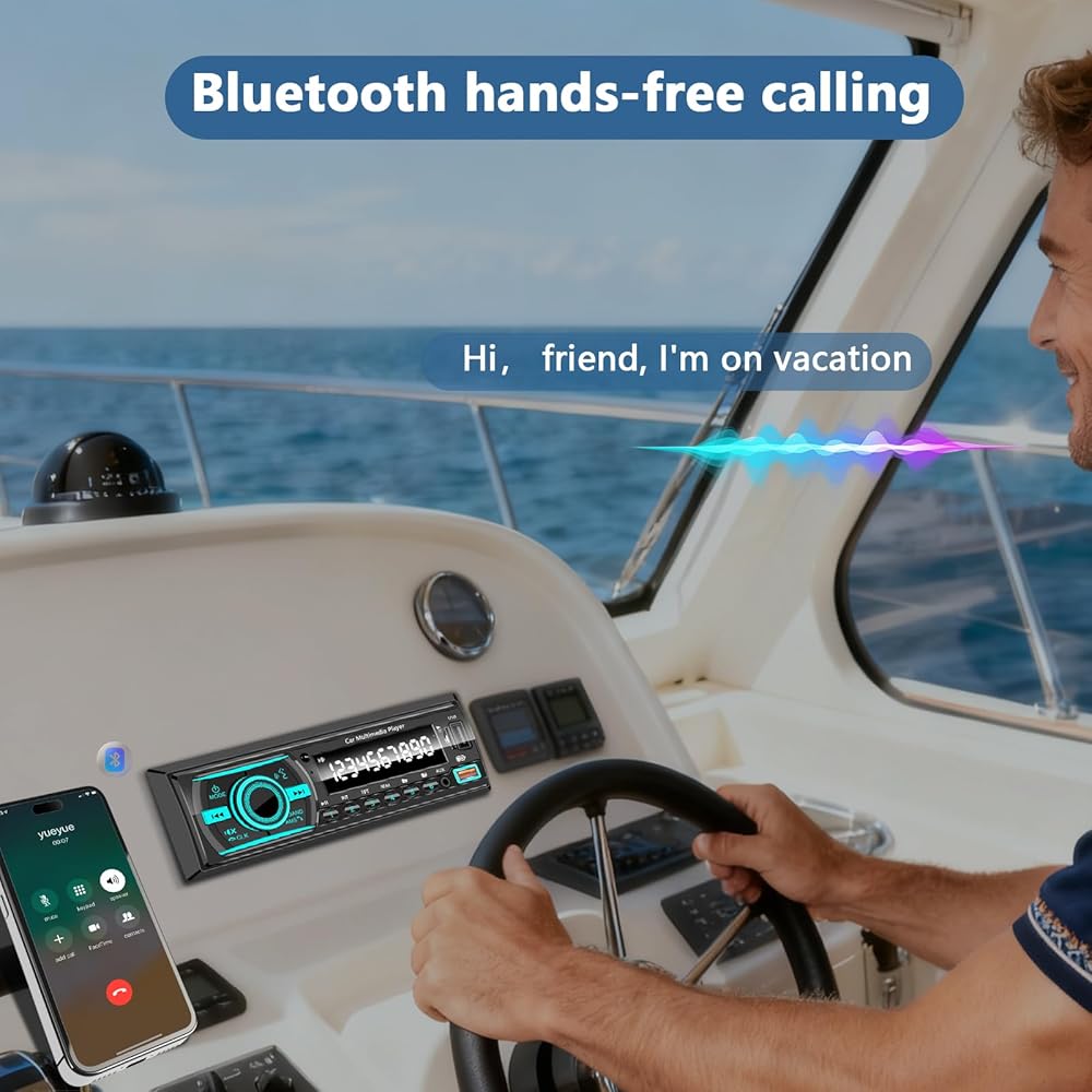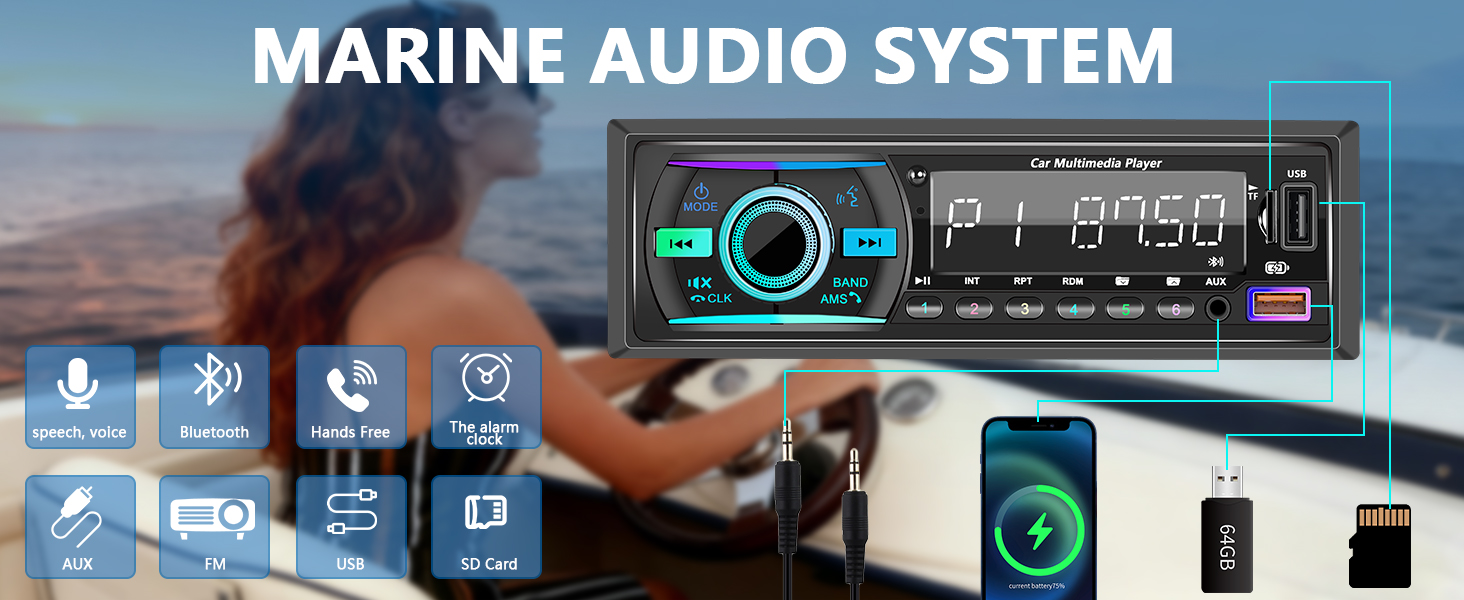 • وظائف الوسائط الكاملة: يحتوي على موالف FM مدمج لمحطات الأخبار أو الرياضة أو الموسيقى في الوقت الفعلي. يتيح لك تعديل EQ تخصيص أنماط الصوت (على سبيل المثال، Pop، Rock). يمكنك تشغيل ملفات MP3 عبر منفذ USB، أو بطاقة TF، أو توصيل الأجهزة الخارجية من خلال منافذ RCA - مما يغطي جميع احتياجاتك الصوتية لرحلات القوارب.