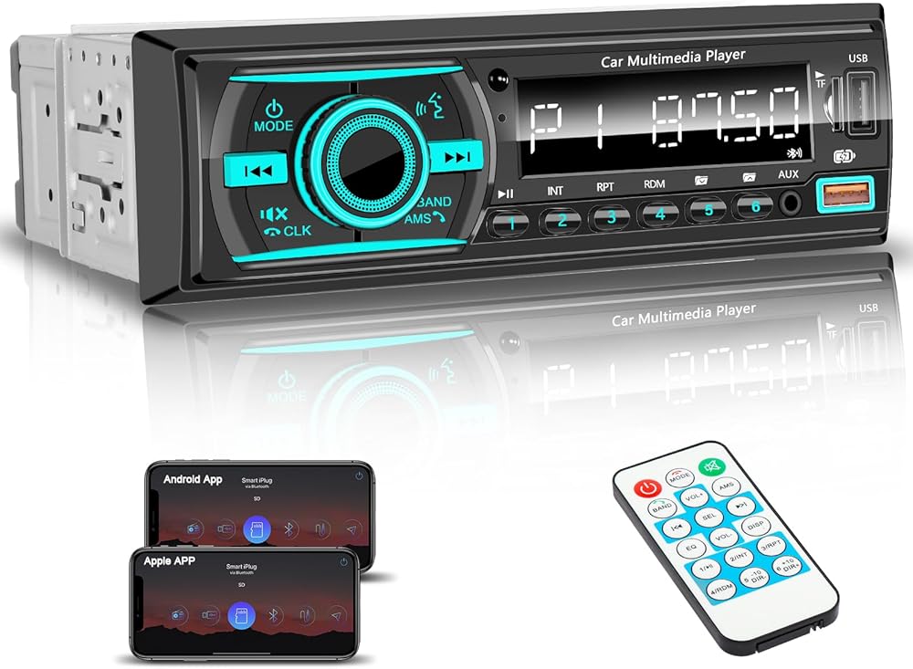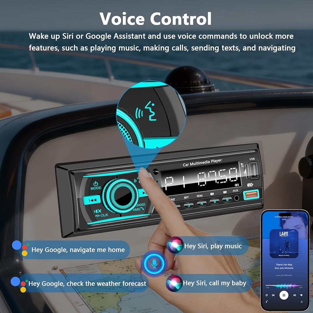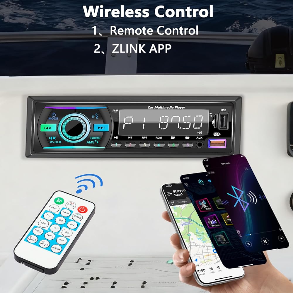 راديو بحري واحد DIN بلوتوث للسيارة، وحدة استقبال ستيريو للقارب مع نظام تشغيل iOS/Android، ميكروفون مدمج، شاشة LCD رقمية، RCA، MP3، FM، EQ، Aux-in، USB، بطاقة TF وجهاز تحكم عن بعد للتطبيقات