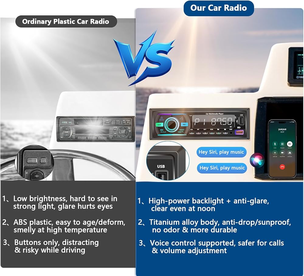 • إضاءة خلفية عالية الطاقة مع تصميم عاكس: على عكس معظم أجهزة الراديو البحرية التي تصبح ضبابية تحت الضوء الساطع، فإن منتجنا يزيل الوهج من خلال إضاءة خلفية عالية الطاقة جنبًا إلى جنب مع تصميم عاكس. حتى عند التنقل في ضوء الشمس الشديد، يمكنك رؤية الراديو والأغاني والمكالمات الواردة بوضوح دون التحديق.