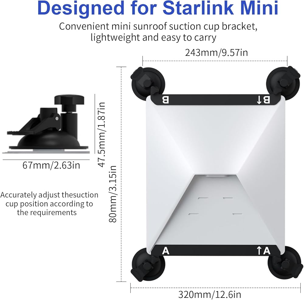 قاعدة أكواب شفط قوية: يتميز حامل كأس الشفط الصغير Starlink بأكواب شفط قوية يتم ربطها بشكل آمن بنوافذ السيارة وأسقف الشمس، مما يضمن بقاء Starlink Mini ثابتًا في مكانه أثناء السفر، سواء كنت تستخدمه كحامل سيارة Starlink أو للمركبات الترفيهية والقوارب.