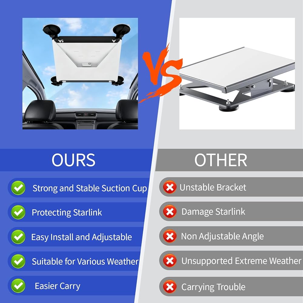 متين ومقاوم للطقس: مصنوع من مواد متينة ومقاومة للتآكل، وقد تم تصميم حامل Starlink Mini Suction Mount ليتحمل الظروف الجوية القاسية وتجارب الطرق الوعرة، مما يوفر أداء طويل الأمد لجميع ملحقات Starlink الصغيرة الخاصة بك.