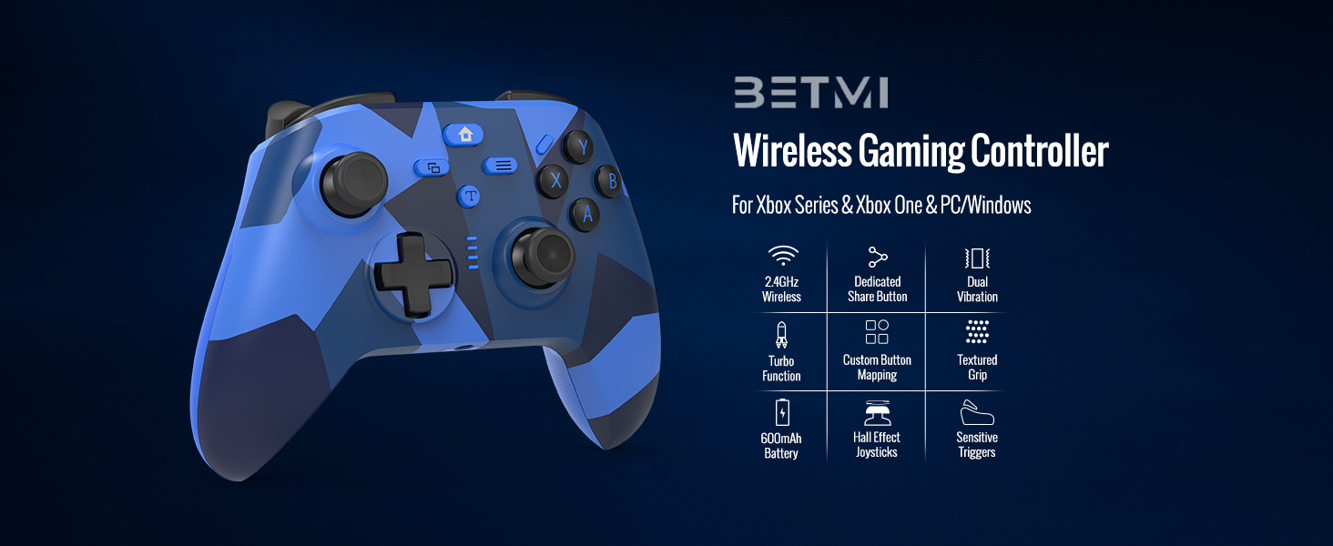 BETMI لوحدة تحكم Xbox اللاسلكية مع محول 2.4 جيجا هرتز/عصا التحكم بتأثير القاعة/مقبس صوت TRRS/Turbo/Marco/اهتزاز مزدوج، لوحة ألعاب متوافقة مع Xbox One، Xbox Series X/S، Xbox One X/S، الكمبيوتر الشخصي (أزرق مموه)