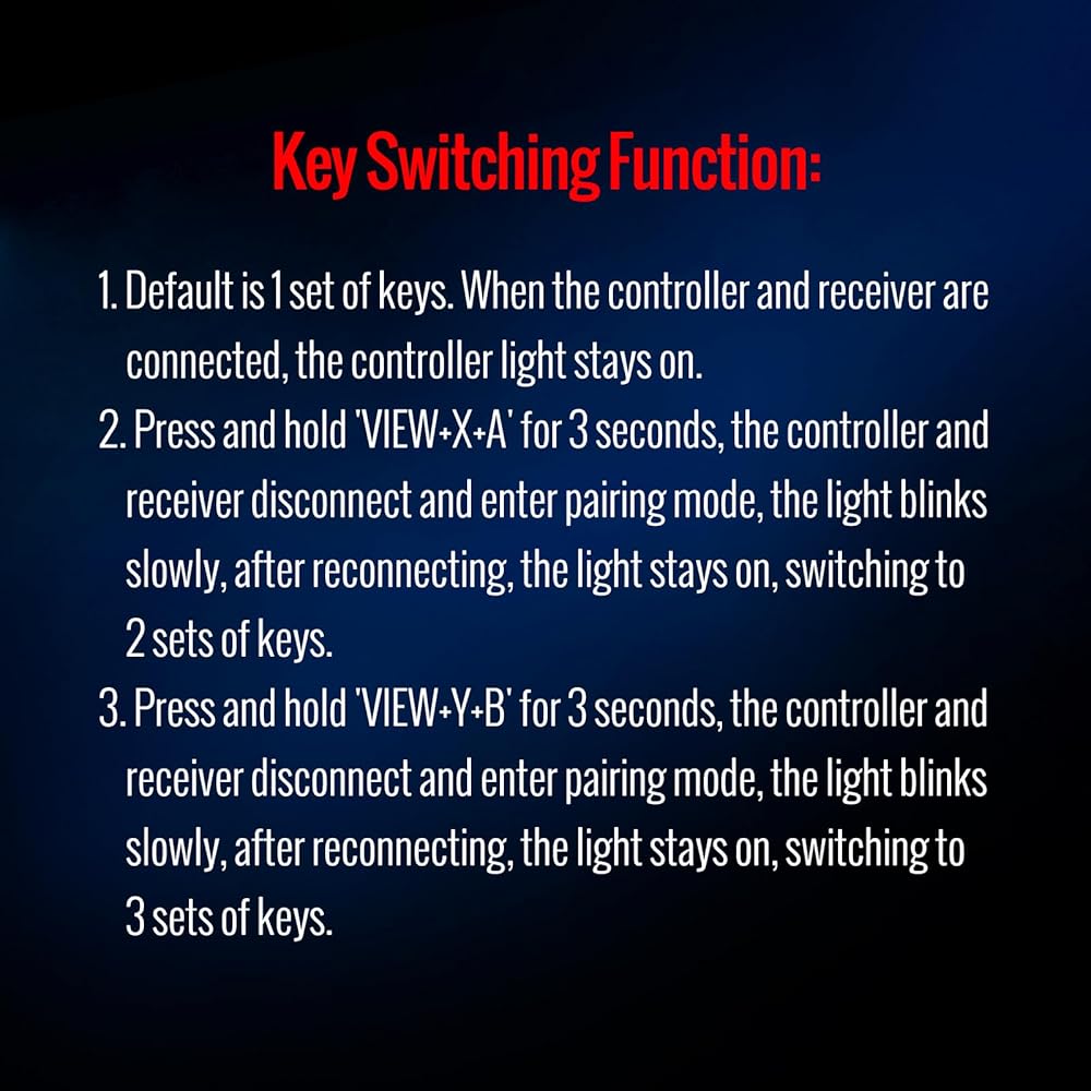 وظيفة تبديل المفاتيح: 1. الافتراضي هو مجموعة واحدة من المفاتيح. 2. اضغط مع الاستمرار على "VIEW+X+A" في وقت واحد لمدة 3 ثوانٍ، سيتم فصل وحدة التحكم وجهاز الاستقبال والدخول في وضع الاقتران، وسيومض الضوء ببطء، وبعد إعادة الاتصال، سيبقى الضوء قيد التشغيل، ويتحول إلى مجموعتين من المفاتيح. 3. اضغط مع الاستمرار على "VIEW+Y+B" في وقت واحد لمدة 3 ثوانٍ، وسيتم فصل وحدة التحكم وجهاز الاستقبال والدخول في وضع الاقتران، وسيومض الضوء ببطء، وبعد إعادة الاتصال، سيبقى الضوء قيد التشغيل، ويتحول إلى 3 مجموعات من المفاتيح