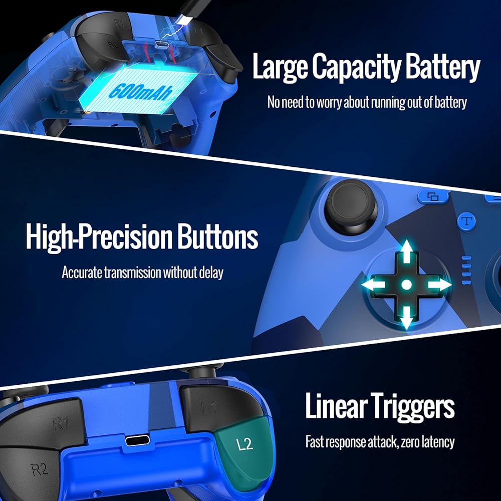 تجربة غامرة: قل وداعًا للانقطاعات أثناء اللعب. تم تجهيز وحدة التحكم بسرعة 2.4 جيجا هرتز ببطارية مطورة بقوة 600 مللي أمبير في الساعة توفر ما يصل إلى 8 ساعات من اللعب بشحنة واحدة. بفضل عمر البطارية الممتد، يمكنك الانغماس في اللعبة لفترة أطول دون القلق بشأن نفاد الطاقة