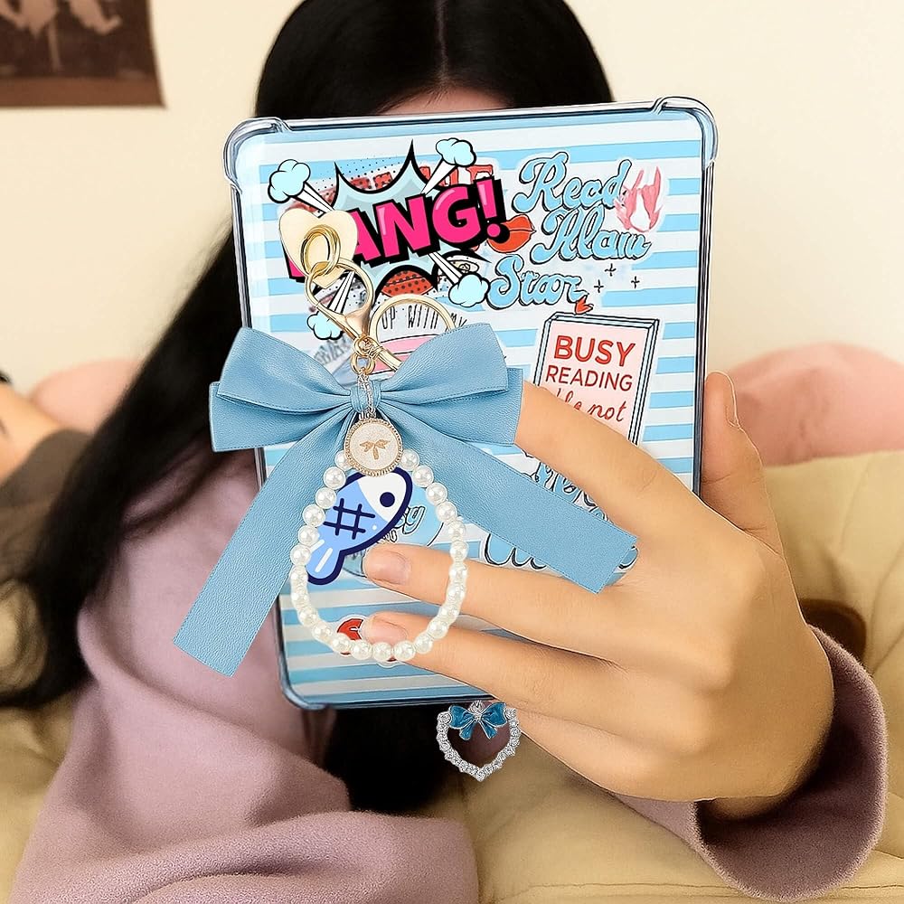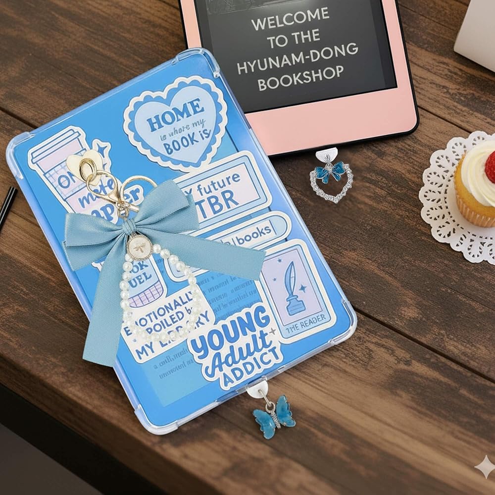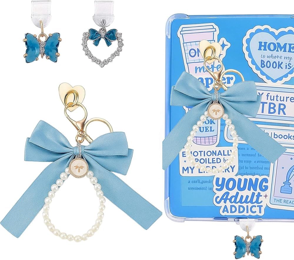 【Enhance Your Kindle's Style】This charming Kindle accessories set includes a delicate blue pearl bow keychain and two cute dust plug charms (heart and bow design). Perfect for adding a personal touch to your Kindle Paperwhite, Kindle Scribe, and other e-readers, making your device stand out in style.