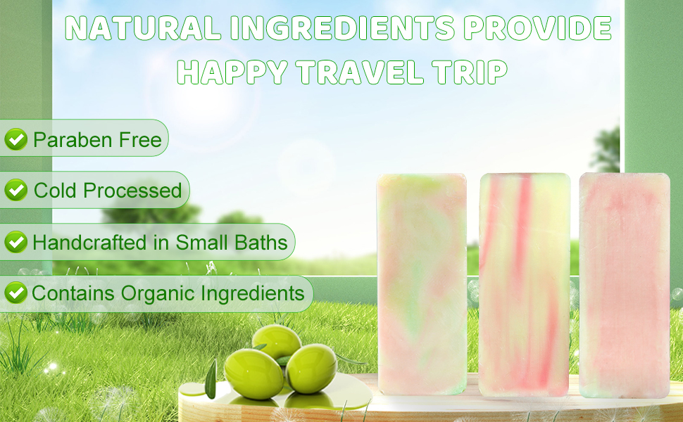 • مكونات عالية الجودة صابون يد صغير - تحتوي مجموعة مستلزمات الاستحمام بحجم السفر على عطر خفيف للجنسين. تم تركيبه خصيصًا لغسول لطيف للجسم والوجه. مصنوع من زيت الزيتون الطبيعي بنسبة 75% (أساس نباتي) ولا يحتوي على منتجات حيوانية ثانوية (نباتي). لا توجد مكونات ضارة ولم يتم اختبارها على الحيوانات مطلقًا