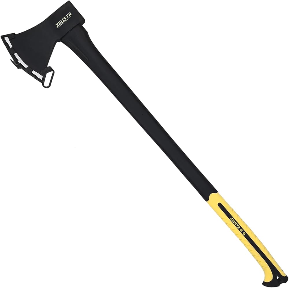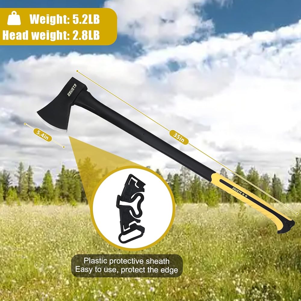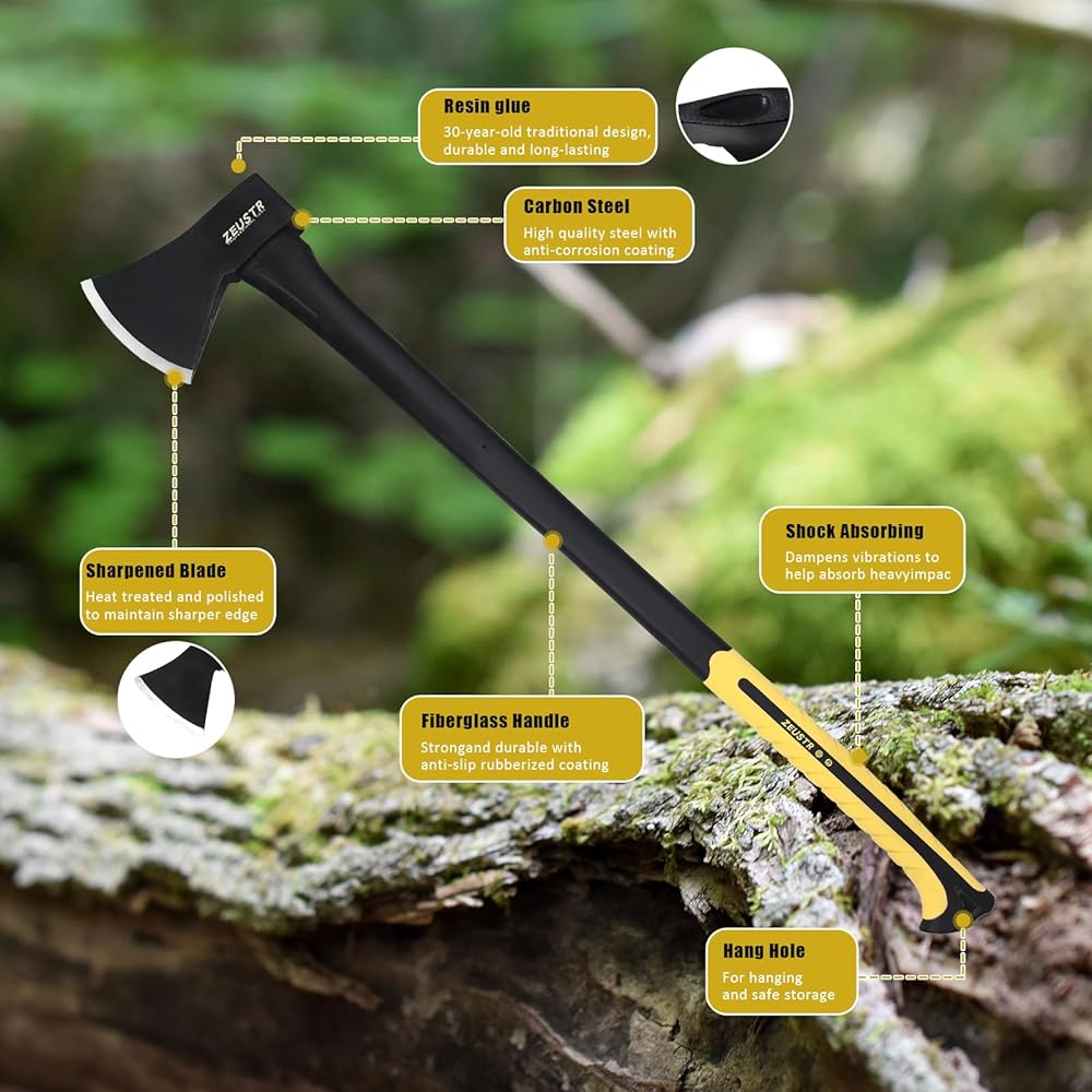 فأس تخييم طويل 91.44 سم، شفرة فولاذية مزورة مع مقبض ممتص للصدمات، فتحة خارجية للتخييم والمطبخ، تقطيع الخشب والتلطيف